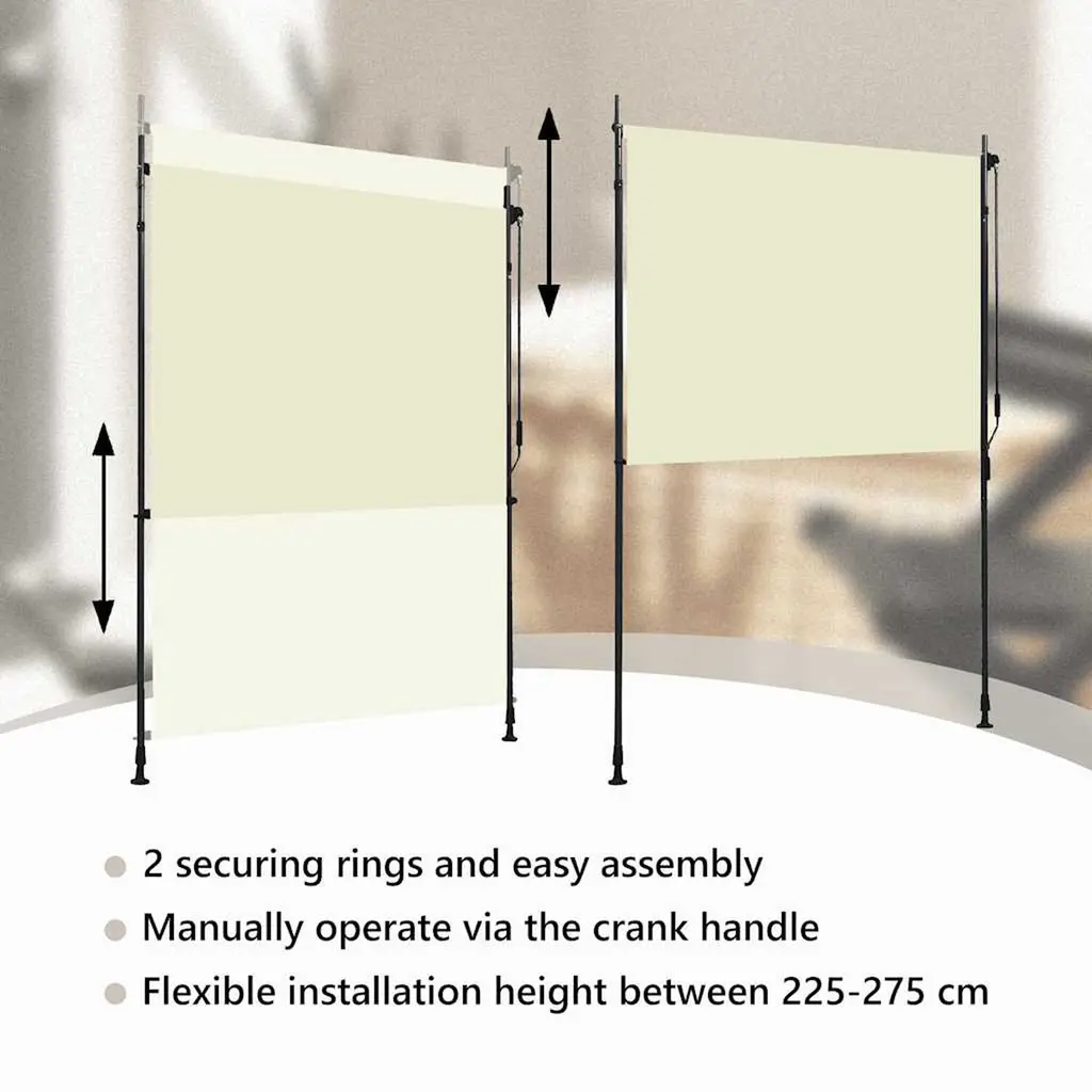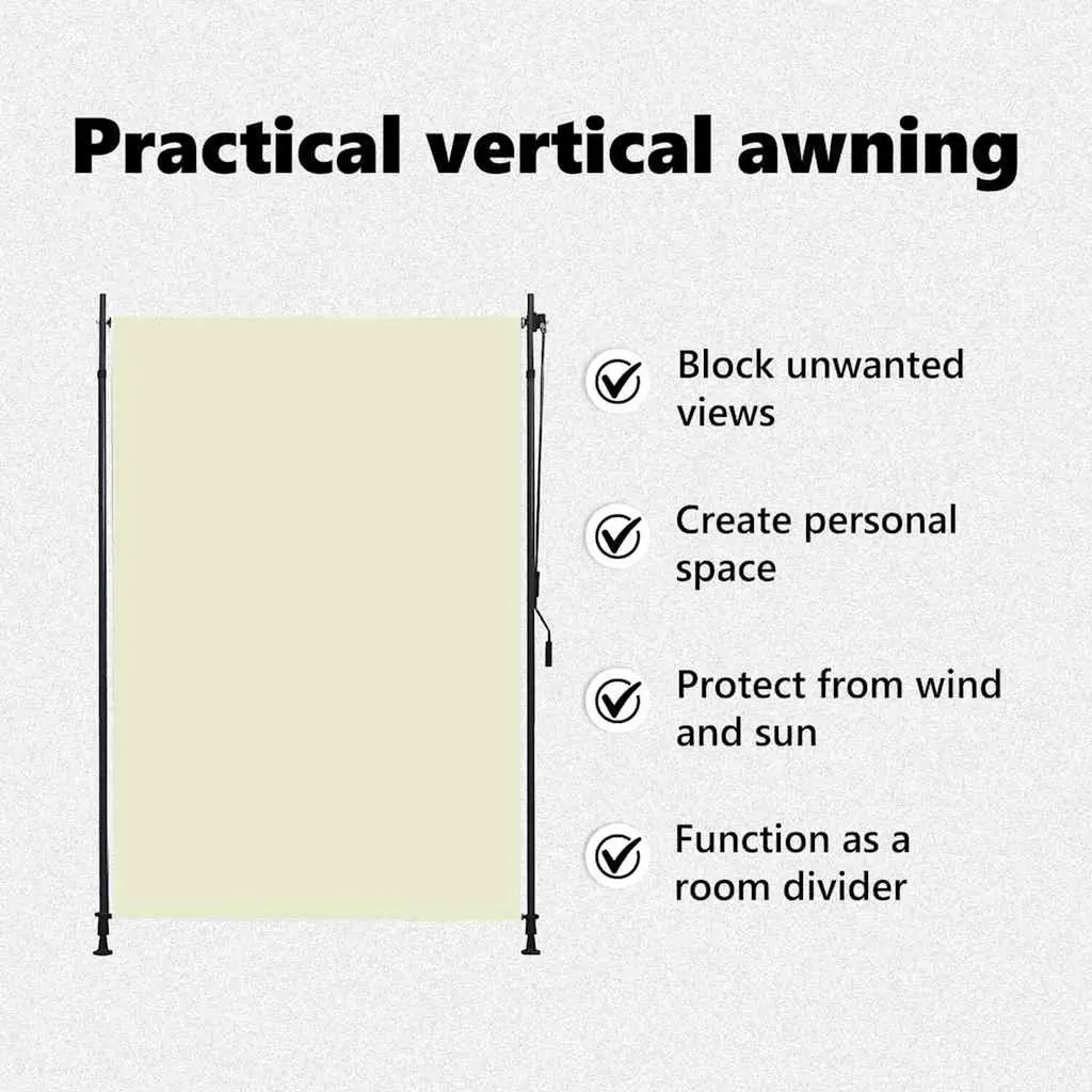 This Manual Outdoor Vertical Roller Blind is a top choice for anyone wanting to upgrade their outdoor spaces with style and functionality. Measuring 59.1 x 106.3 in, this sleek roller blind provides shade and creates a welcoming vibe while blocking out harsh sunlight. UV Resistance: This roller blind is made from special UV-resistant materials that do a great job of keeping sun damage at bay. Your outdoor area stays comfy and well-shaded.Height Adjustable: With a manual height adjustment, this blind can be set just how you like it. You can easily reposition it to get the right coverage any time of day.Smart Design: The cream shade and sleek finish make it a stylish addition to your balcony or patio. It looks great with all your outdoor decor.Durable Construction: Made from polyester fabric with PA, this blind is fade-resistant and built to withstand different weather, ensuring it lasts.Easy Installation: It comes with adjustable posts and a hand crank for easy use, so setting it up is a piece of cake.