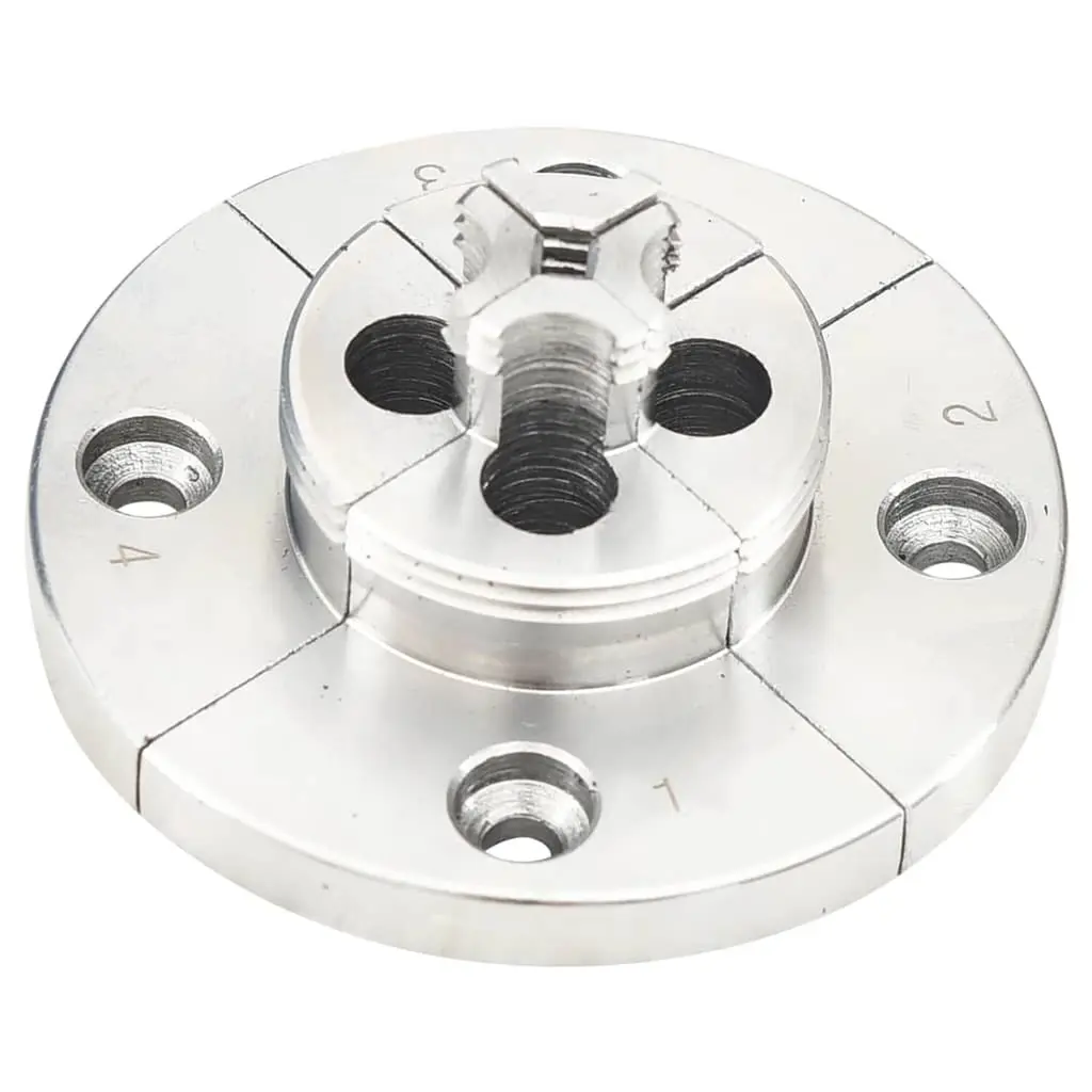This wood chuck set for 3.74 " (3,75 inches) is a mechanical device used to clamp a workpiece on a machine tool.Made of steel, the set is durable and sturdy. As a machine tool accessory, it uses the radial movement of movable jaws evenly distributed on the chuck to clamp and position the workpiece. This wood lathe chuck set includes a 4 jaw self-centering chuck and interchangeable jaws for spindles, bowls, and work-pieces that are hard to be secured. The set will fit 1" x 8 TPI spindle.