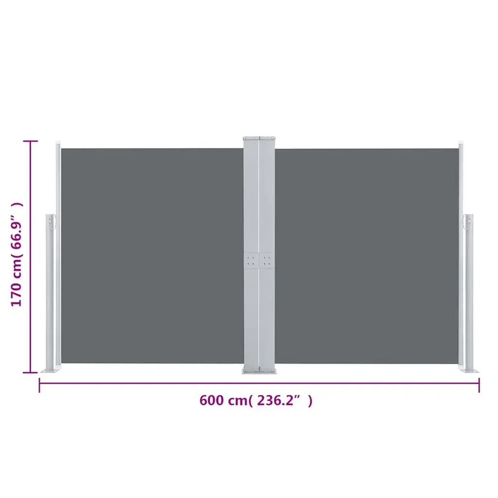 This retractable side awning is spot on for creating privacy and shelter from the sun. It makes your terrace or balcony a cozy spot to hang out, even on bright sunny days or breezy evenings. It's made with a smooth anthracite polyester fabric and a sturdy grey powder-coated steel frame, adding to the style while providing functionality with its modern look that fits a variety of outdoor designs. Retractable Design: Adjust it manually to get the shade and wind cover just right for you.Durable Build: Built with weather-resistant materials, this awning handles various weather while still looking good.Extra Protection: It offers UV protection for you and your family while you’re enjoying the outdoors, making it ideal for sunny days.Easy Installation: Comes with everything you need for hassle-free setup, so you can start enjoying it right away.Perfect Size: At 67 in high and extending to 236.2 in, it's just the right size for your balcony or terrace, fitting well in different spaces.