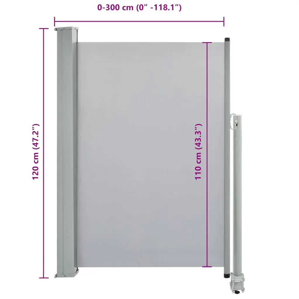 This retractable side awning is a must-have for any outdoor spot, giving you shade and privacy whenever you want. Made from top-notch materials, it jazzes up your terrace, patio, or balcony, offering a modern and chic touch to outdoor living while keeping you protected from the sun. The retractable feature makes it easy to adjust, letting you pull out or tuck away the awning as you like to control sunlight and privacy. Made with materials that resist UV rays, this awning keeps harmful sunlight at bay, ensuring a comfy outdoor experience during summer. Its lovely grey color and sleek style can match all sorts of outdoor decor, making it a flexible addition to your space. Built for the outdoors, this awning is tough enough to hold up against the weather, giving reliable performance all season long. At 47.2 x 118.1 in, it offers plenty of coverage, suitable for various areas, whether at home or at a business.
