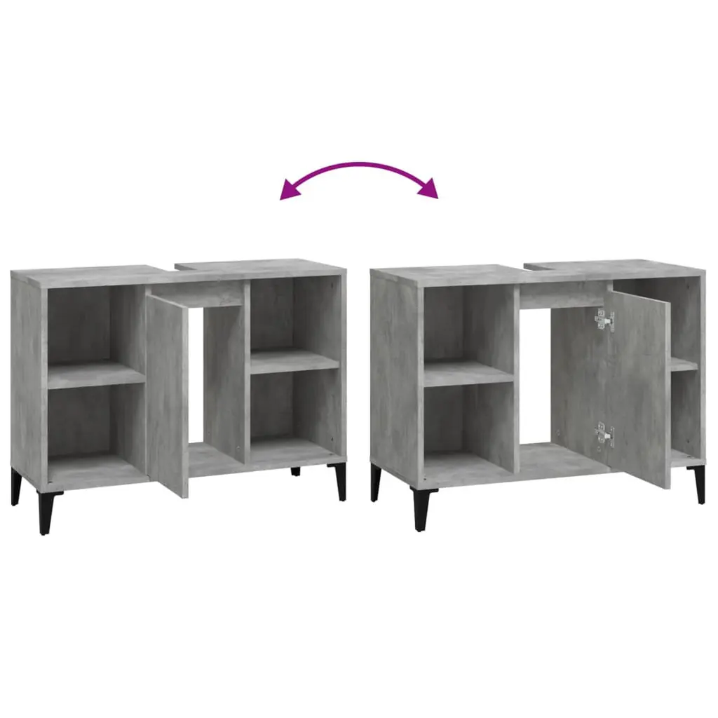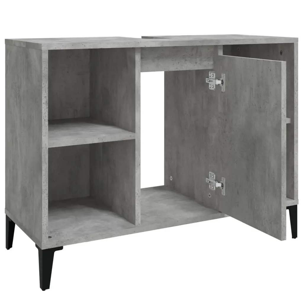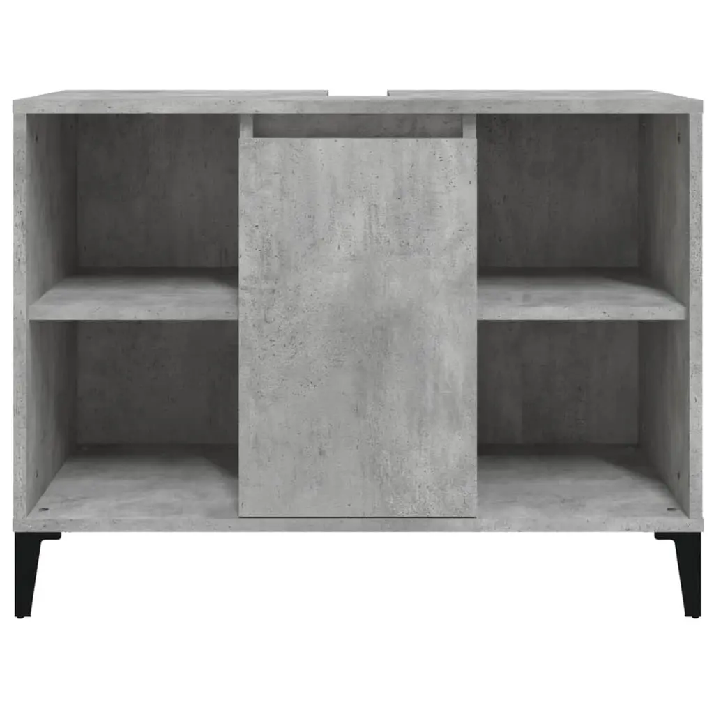 This sink cabinet is both stylish and practical, making it a must-have for your bathroom. The chic concrete grey finish enhances its modern look, fitting in nicely with different decor styles while offering a handy storage solution for your essentials. Spacious Storage: This cabinet offers loads of space with its five compartments, ideal for keeping everything from toiletries to cleaning stuff organized. You can fit in all your essentials and keep the bathroom neat and tidy.Elegant Industrial Design: The modern industrial style of this sink cabinet, with its matte finish and chrome details, not only makes your bathroom look classier but also adds a touch of sophistication.Quality Engineered Wood: Made from high-quality engineered wood that's moisture-resistant, this cabinet is built to stand the test of time. It's tough against humidity and everyday use, ensuring your investment lasts.Adjustable Features: This product has adjustable features to meet your needs. The flexible door setup makes assembly a breeze, so it's super user-friendly.Versatile Usage: Perfect for a bathroom as a vanity unit or extra storage, this cabinet suits adults needing an organized space for personal items. Its compact size makes it great for smaller bathrooms too.