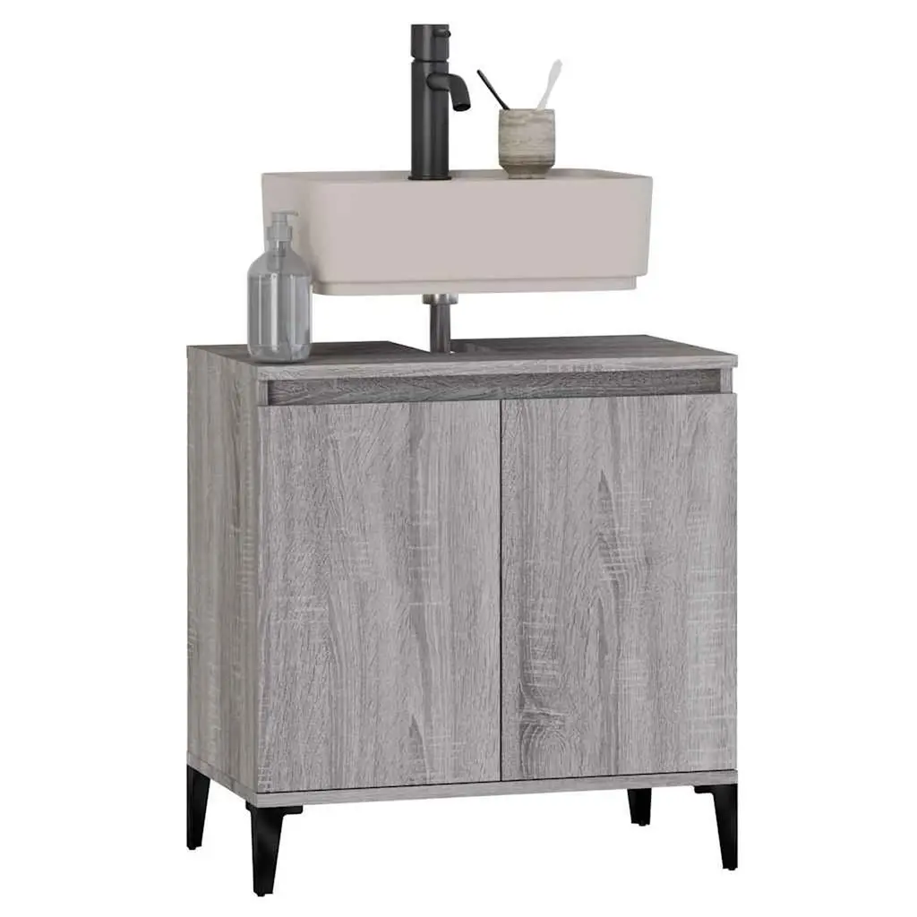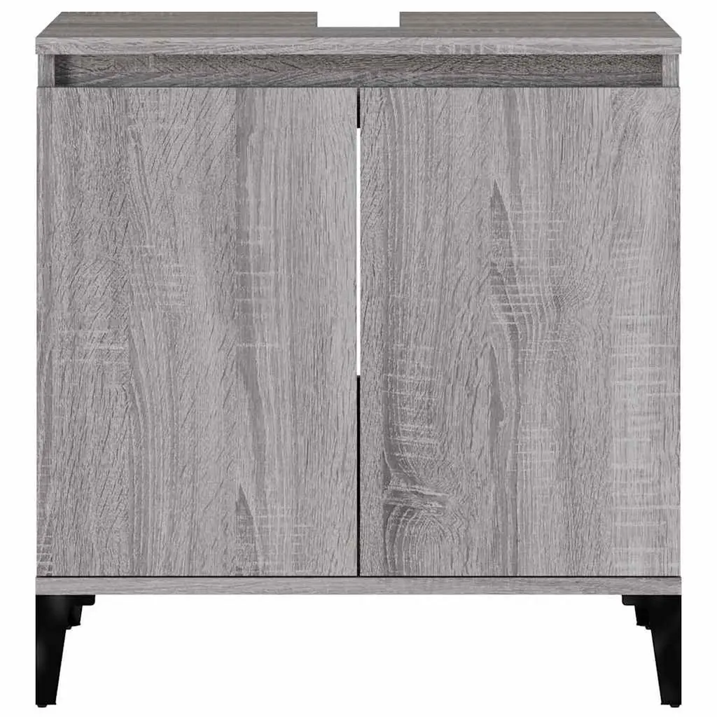 This sink cabinet combines functionality and style, making it a perfect addition for any bathroom. With a classy grey Sonoma finish, it fits in well with various decor styles while providing practical under-sink storage to keep your bathroom neat and tidy. Strong and Sturdy Construction: This sink cabinet is built to last with high-quality engineered wood, making it a dependable choice for regular use. Its robust design handles the demands of a busy bathroom.Stylish Grey Sonoma Finish: The classy grey finish adds elegance to your bathroom. This neutral color works well with both modern and traditional styles, giving a sophisticated look while remaining versatile.Convenient Under-Sink Storage: With plenty of storage space, this cabinet maximizes what you've got, keeping your toiletries and cleaning supplies hidden away but easy to reach, keeping your bathroom tidy.Hinge Door Design: The cabinet features hinge doors that open smoothly for easy access to your items. It’s a practical design that also looks nice, fitting in well with your bathroom.Simple Care Instructions: Keeping this cabinet clean is a breeze. Just wipe it down with a damp cloth, and it’s resistant to stains due to its high-quality finish.