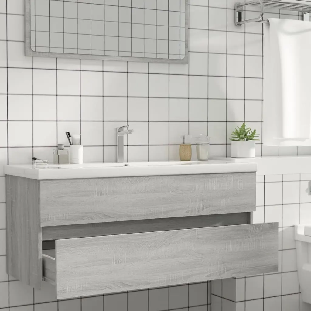 This sink cabinet is all about modern design and functionality, making it spot on for contemporary bathrooms. Its chic Grey Sonoma finish and wall-mounted setup give it a polished look while freeing up precious floor space, keeping your bathroom clean and stylish. Space-Saving Design: This wall-mounted sink cabinet helps keep your floor space uncluttered, making it ideal for smaller bathrooms. It lets you create a tidy, organized look, while keeping everything you need within reach.Contemporary Style: The sleek Grey Sonoma finish and smooth surface add a modern touch to your bathroom decor. This minimalist piece fits smoothly into any contemporary setting, enhancing the overall style.Durable Construction: Crafted from high-quality engineered wood, this cabinet is built to last and keeps looking good. Its water-resistant features ensure it remains a dependable storage solution in a moist bathroom environment.Easy Maintenance: The smooth finish means this cabinet is a breeze to keep clean; just a quick wipe with a damp cloth will keep it looking fresh, saving you time and hassle.Ample Storage: With a standard drawer, this cabinet offers flexible organization for all your bathroom essentials. It's a great pick for those who want smart functionality without skimping on style.