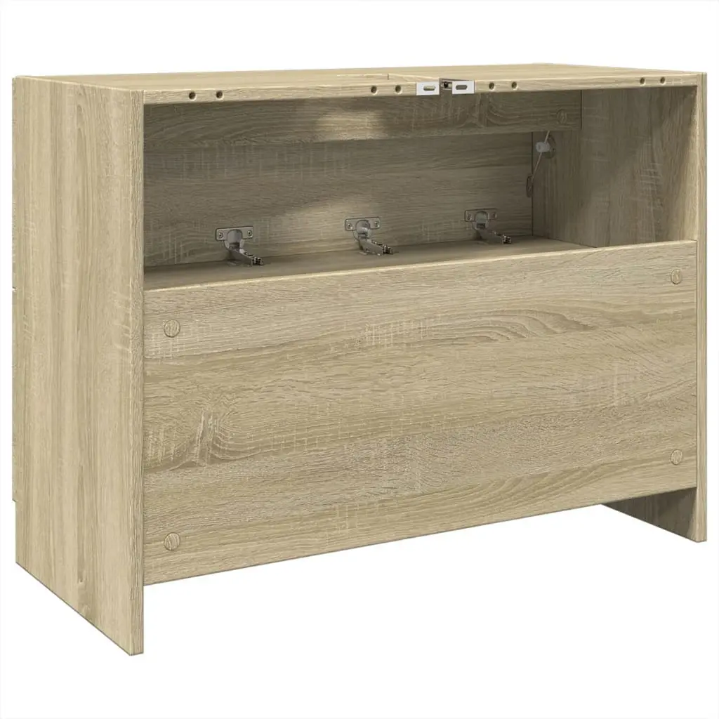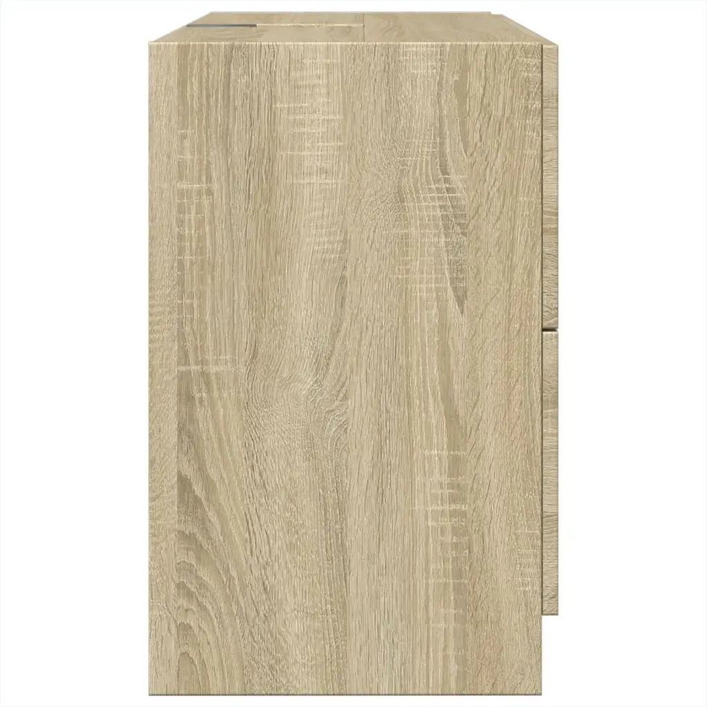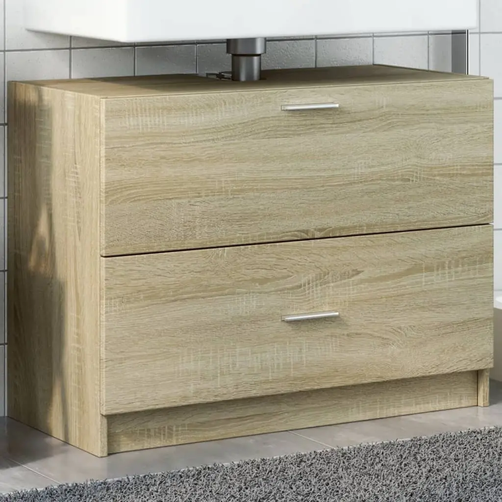 This sink cabinet is a stylish yet functional addition to any bathroom. With its modern Sonoma oak finish, it provides loads of storage while keeping a sleek and contemporary look that suits various decor styles. Ample Storage: The cabinet is designed with plenty of space to keep your bathroom essentials and accessories organized.Modern Design: Its rectangular shape and smooth finish fit perfectly with modern aesthetics, giving a minimalist yet practical vibe to any bathroom.Soft-Close Drawers: The soft-close drawers close gently and quietly, helping to keep your space peaceful.Durable Materials: Built from engineered wood, this cabinet is moisture-resistant, ensuring it lasts well even in humid bathroom conditions.Easy Installation: It comes with everything you need for quick and easy setup, so you can get it sorted without any fuss.