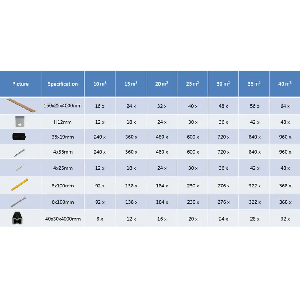 This complete WPC decking board set with accessories, making up a total size of 10 square metres, is perfect for patios, balconies, or areas next to a pool or spa.Made of quality wood plastic composite, our decking boards are water proof and very durable. The decking boards are thick at 0.98 ", making them super strong. In addition, these decking boards have a different pattern on each side. Delivery includes 16 decking boards, 8 keels, 240 plastic clips, 252 stainless steel screws, 92 plastic expansion screws and 12 stainless steel starter clips. This set is easy to assemble.