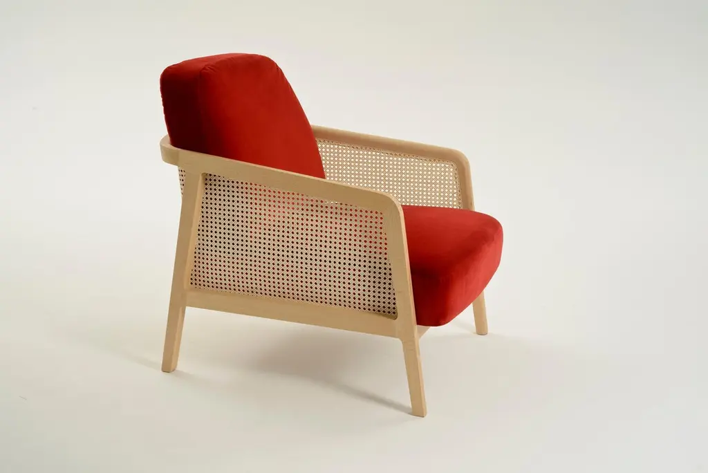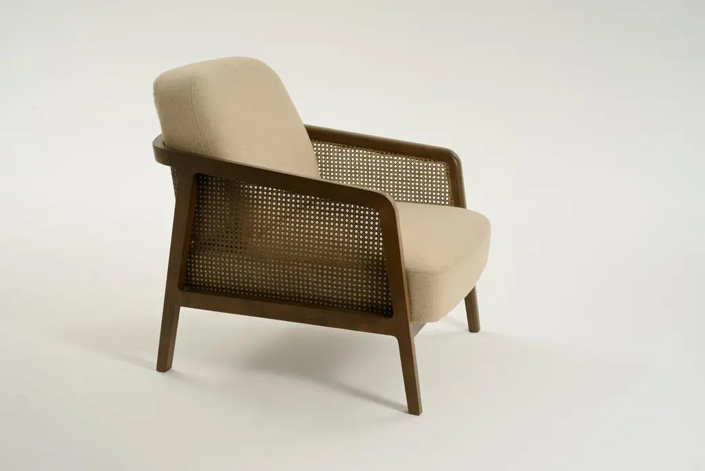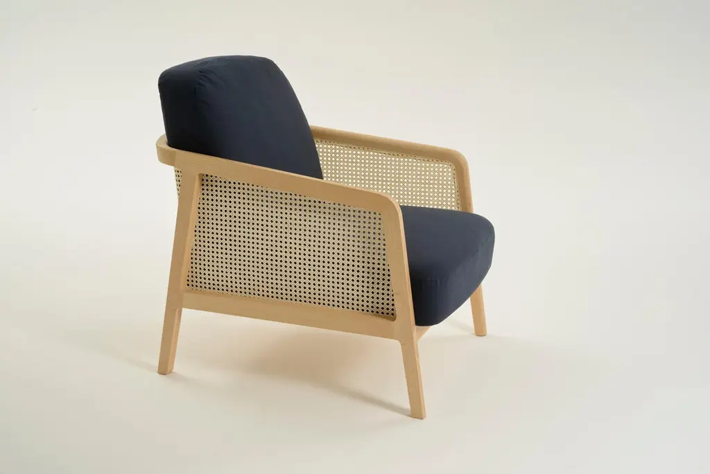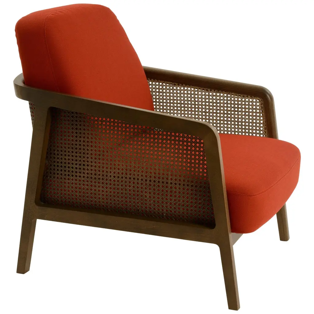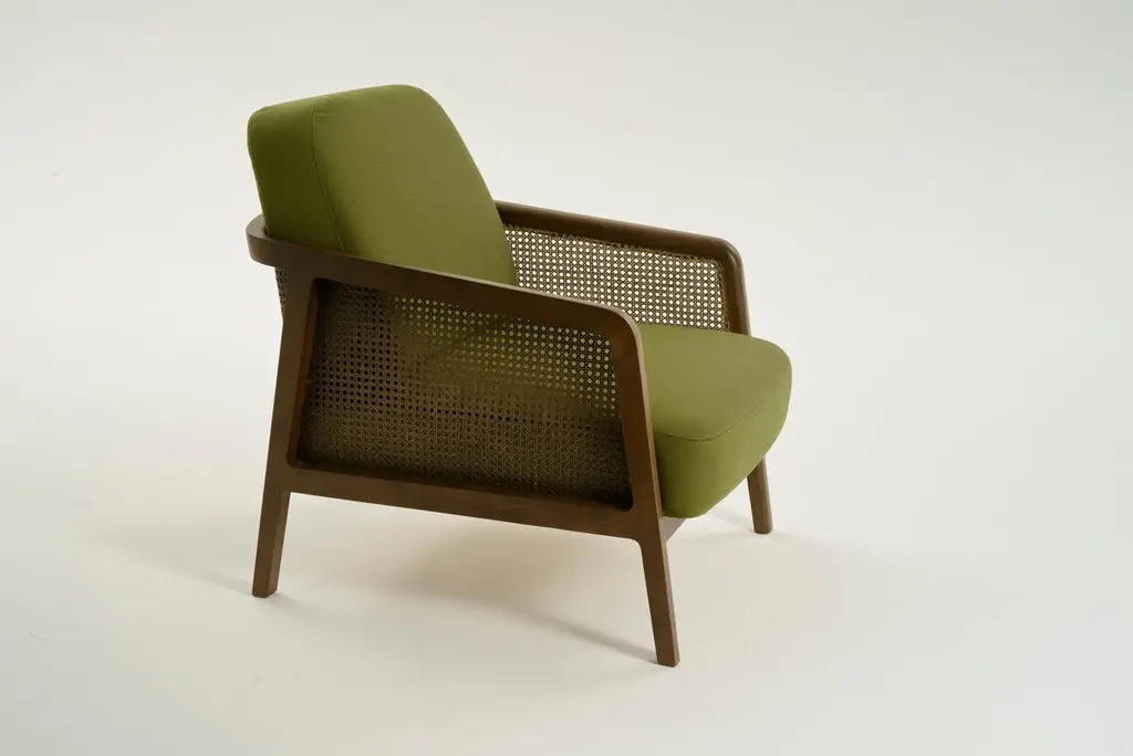 A living room armchair in wood and straw, that recalls the exclusive club atmosphere but in a contemporary key. Vienna is an extraordinarily comfortable and elegant lounge armchair designed by Emmanuel Gallina who loves to quote Brancusi when saying that “simplicity is complexity resolved”. Inspired by Vienna at the end of the 19th century, then up to the 1950s by Marcel Gascoin, through the visions of the American E.J. Brussel. A tribute to Alfred Sloan’s American pragmatism joined to European styling and, in this particular case, to the renowned Italian talent constantly aiming to harmonize beauty and functionality.In solid beech and straw stained Canaletto Walnut, Vienna is a perfect combination between digital machines and handcraft. The structure is in solid beech. The back and sides in hand-braided Vienna straw fixed in a milling. Cushions in polyurethane foam in different densities. Removable lining in different fabric categories: cotton, felt, linen, eco-leather, wool, velvet or can be coated with C.O.M. fabric. Optional 2nd cushion available.Finishing is in natural beech or beech painted walnut Canaletto.