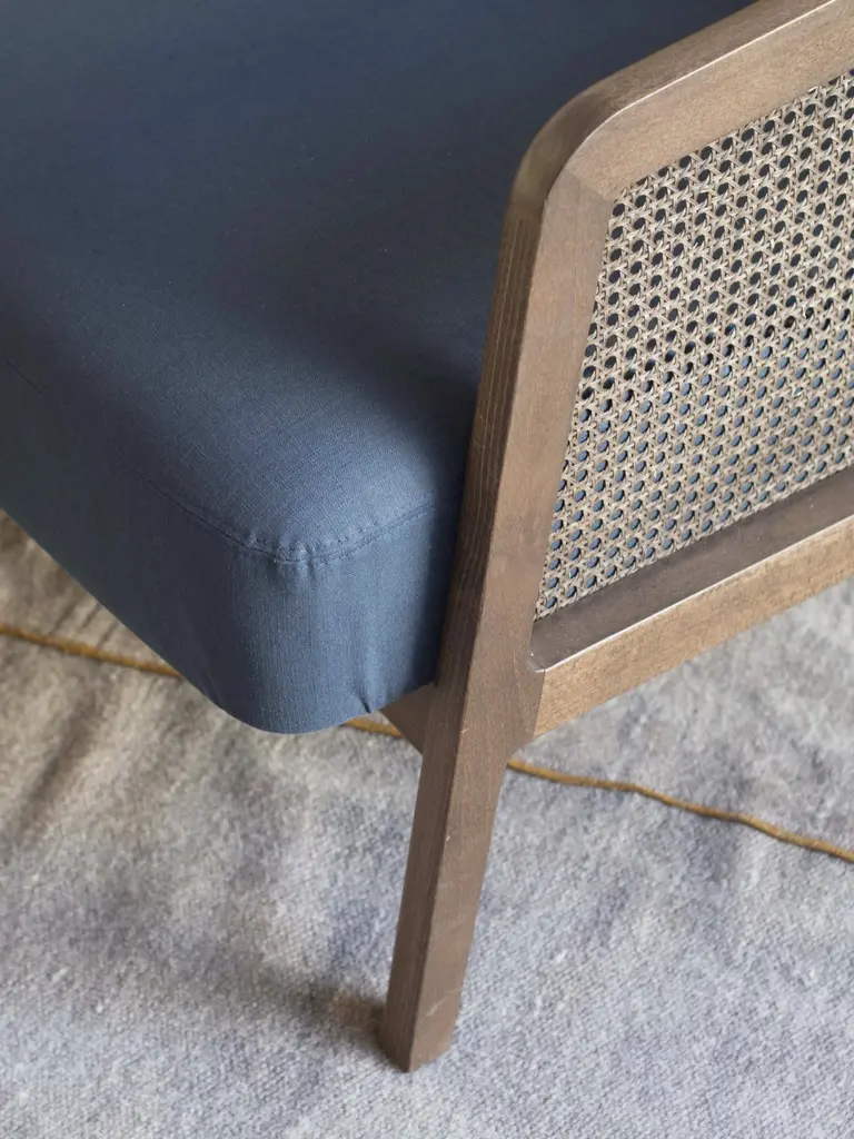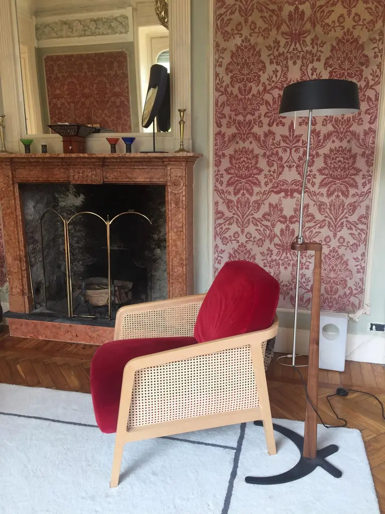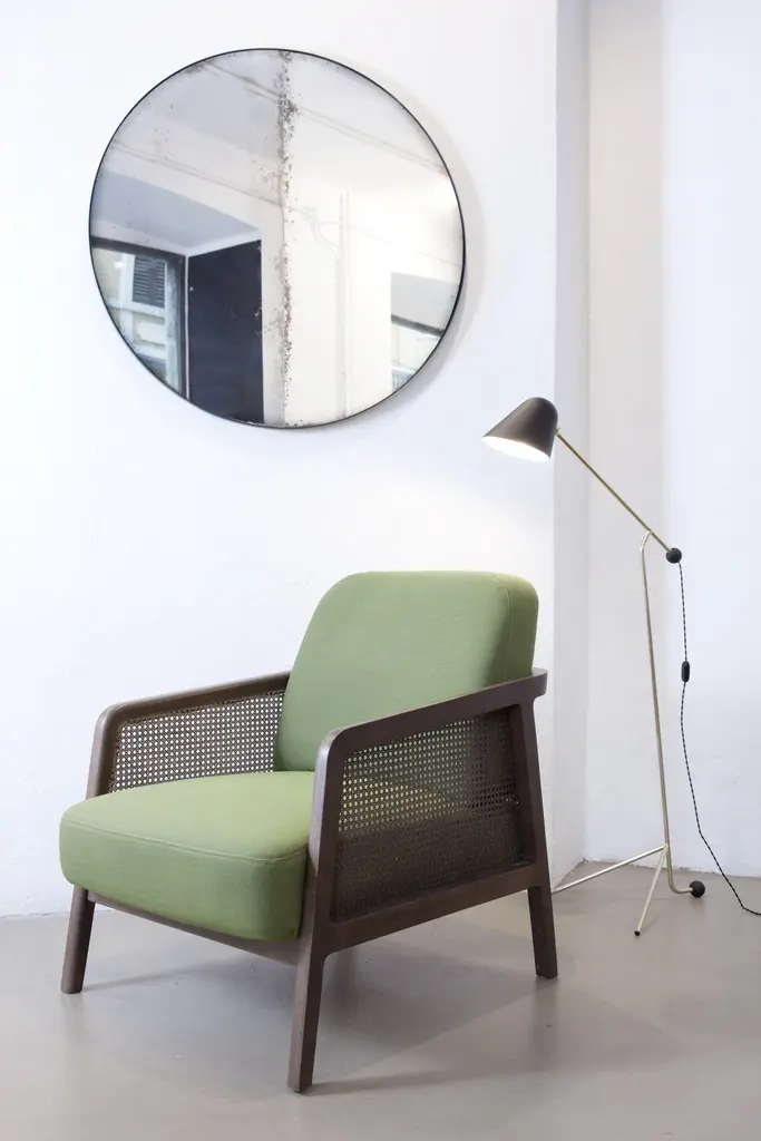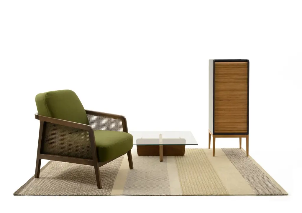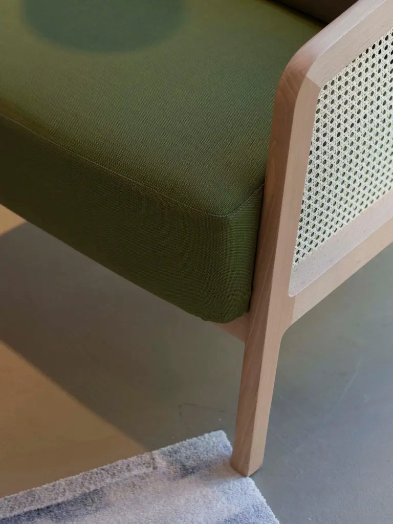 A living room armchair in wood and straw, that recalls the exclusive club atmosphere but in a contemporary key. Vienna is an extraordinarily comfortable and elegant lounge armchair designed by Emmanuel Gallina who loves to quote Brancusi when saying that “simplicity is complexity resolved”. Inspired by Vienna at the end of the 19th century, then up to the 1950s by Marcel Gascoin, through the visions of the American E.J. Brussel. A tribute to Alfred Sloan’s American pragmatism joined to European styling and, in this particular case, to the renowned Italian talent constantly aiming to harmonize beauty and functionality.In solid beech and straw stained Canaletto Walnut, Vienna is a perfect combination between digital machines and handcraft. The structure is in solid beech. The back and sides in hand-braided Vienna straw fixed in a milling. Cushions in polyurethane foam in different densities. Removable lining in different fabric categories: cotton, felt, linen, eco-leather, wool, velvet or can be coated with C.O.M. fabric. Optional 2nd cushion available.Finishing is in natural beech or beech painted walnut Canaletto.