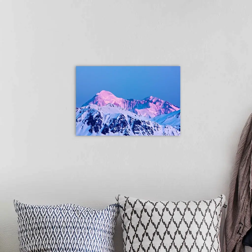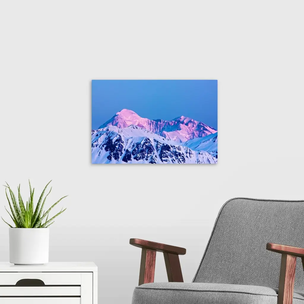 View of dawn alpenglow on the North and South summits of Mount McKinley wall art for home and office decor. Discover canvas art prints, photos, mural, big canvas art and framed wall art in GreatBigCanvas.com's varied collections.