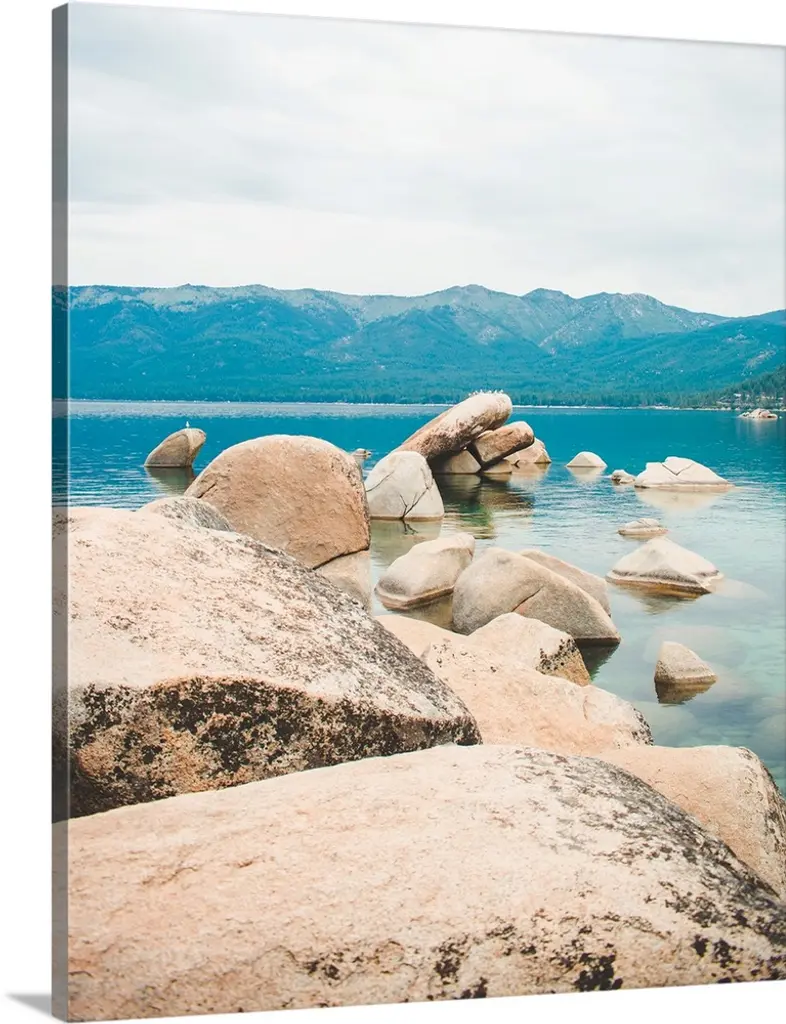There are rocks in the foreground, an island covered with conifer trees in, and the opposing shore in the background in this vertical nature photograph.