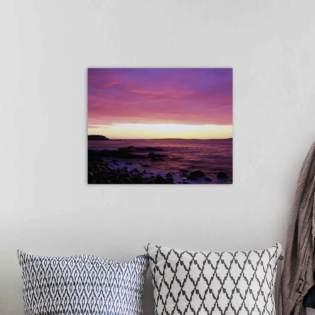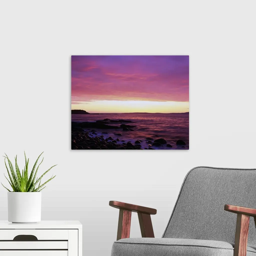 This large piece is a picture taken of the sun rise off the coast of Maine. Rocks line the edge of the water and reach out into the ocean.