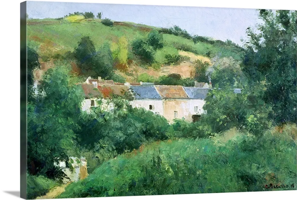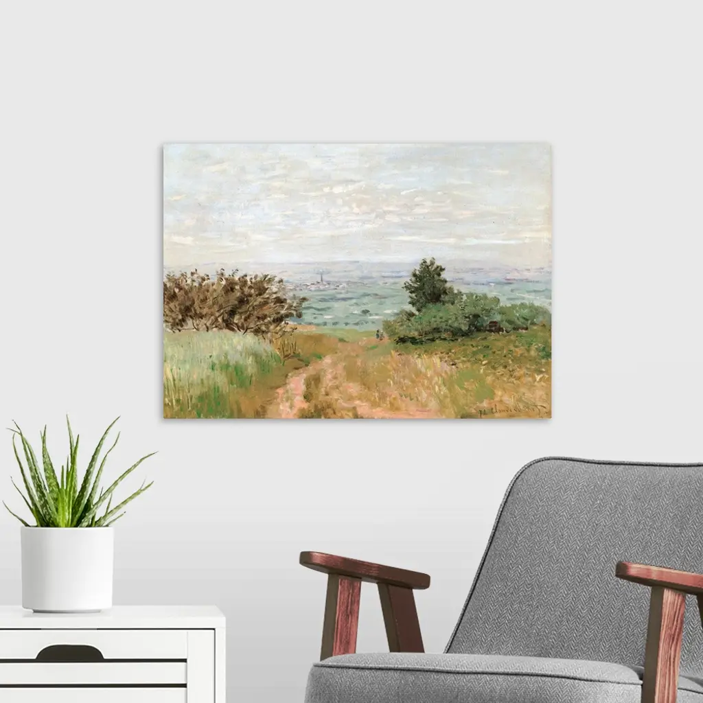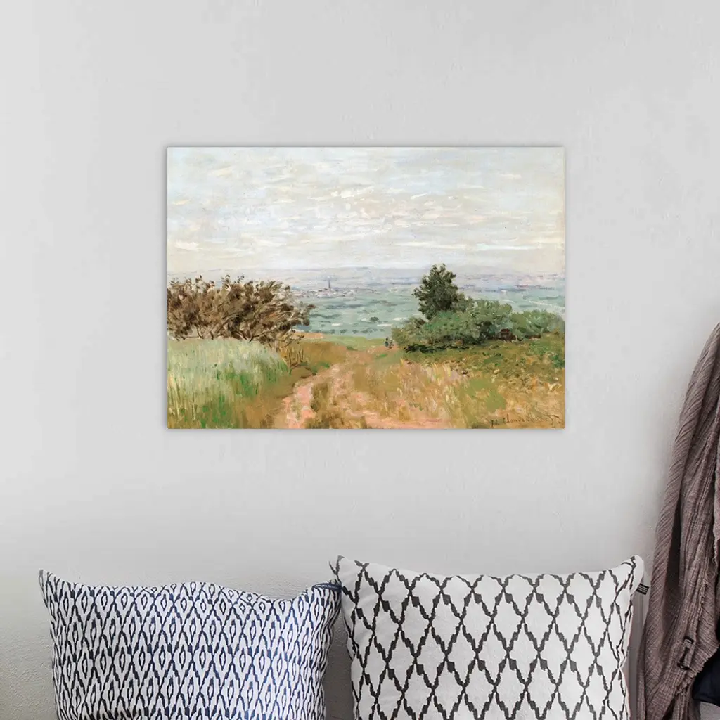 View of the Argenteuil Plain from the Sannois Hill, by Claude Monet, 1872, 19th Century, oil on canvas, cm 52 x 72 - France, Ile de France, Paris, Muse dOrsay. All. Plain hill way street path bush grass green Argenteuil light blue azure meadow. (257506) E