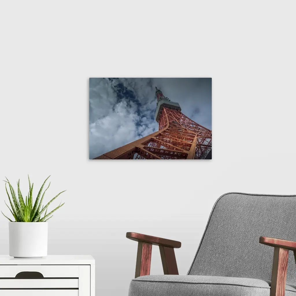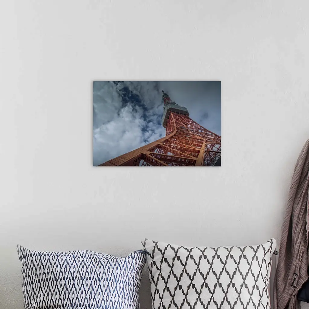 View of Tokyo Tower from its base against cloudy sky, Shibakoen, Minato City, Tokyo, Honshu, Japan