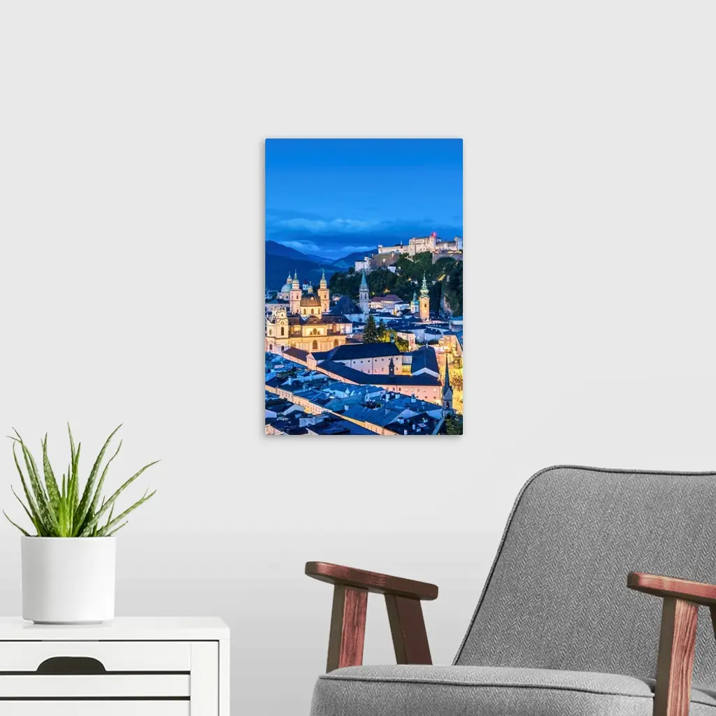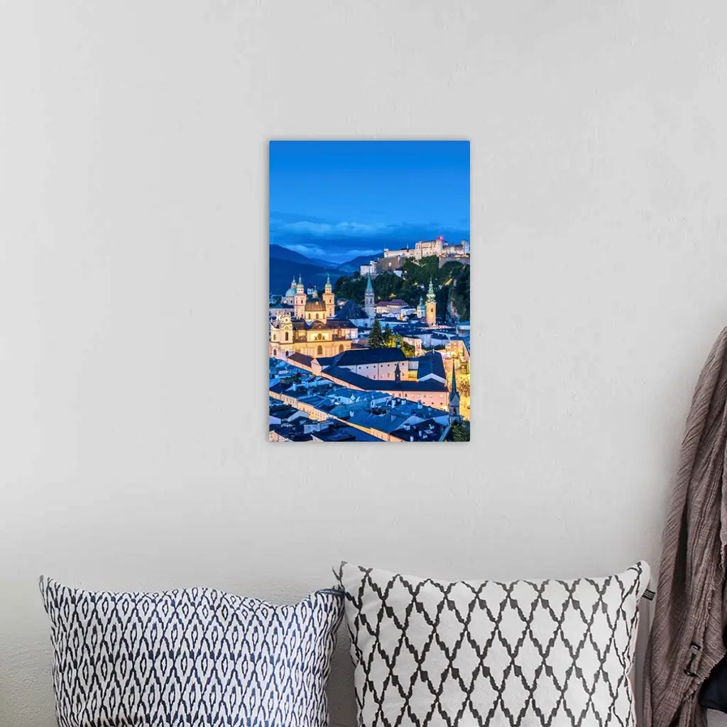 View over the old town and Hohensalzburg Castle at dusk, Salzburg, Austria