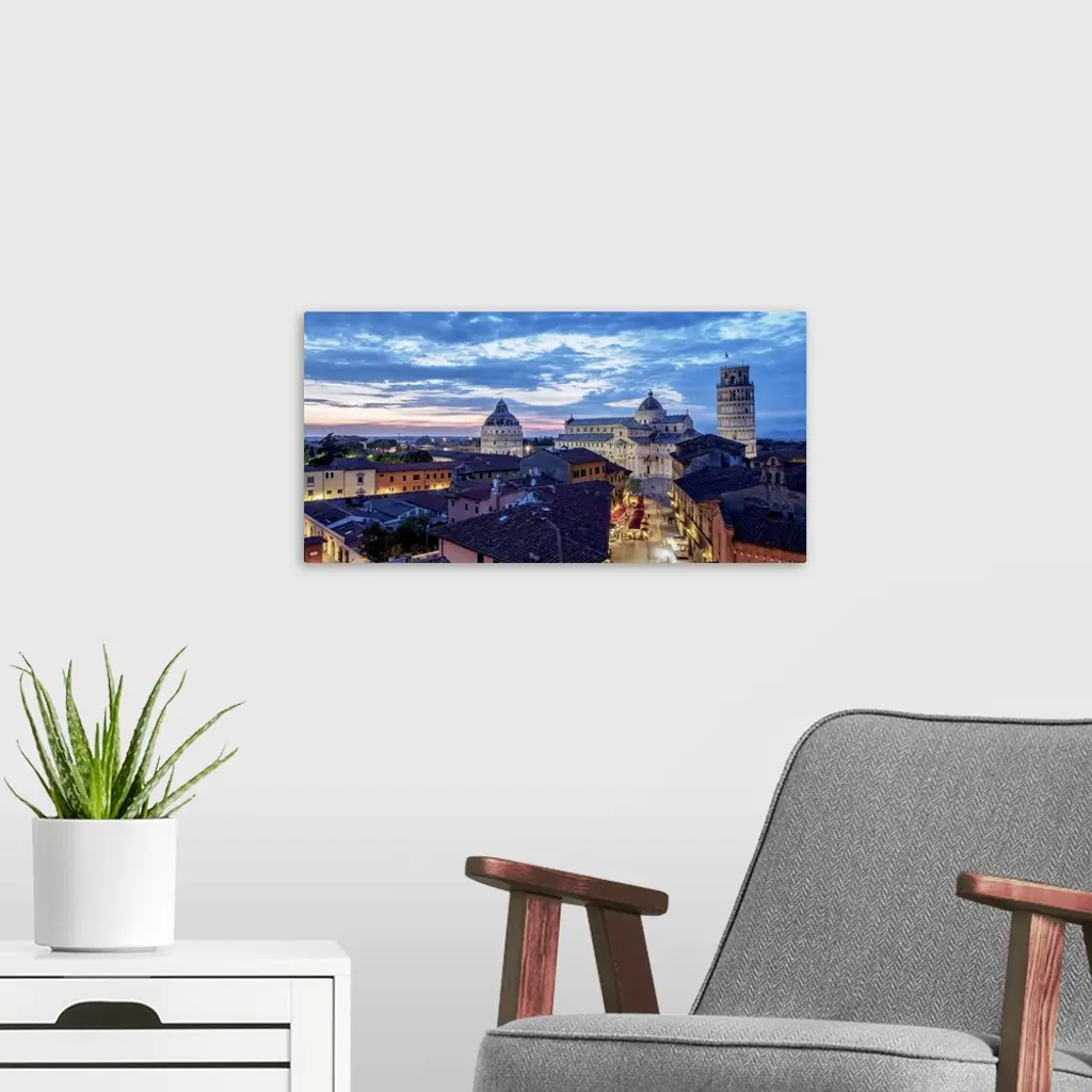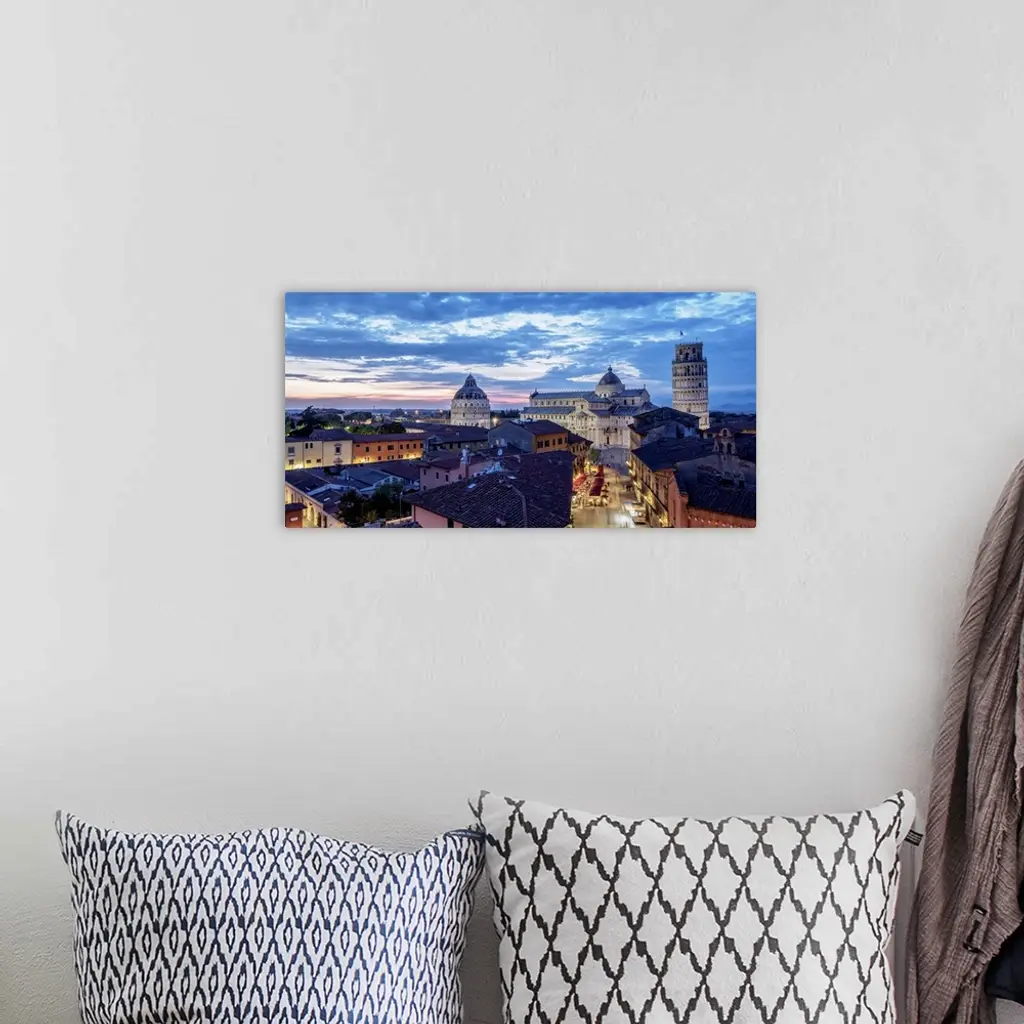 View Over Via Santa Maria Towards Cathedral And Leaning Tower At Dusk, Pisa, Italy