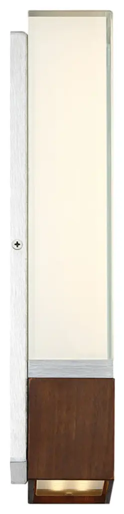 Dark walnut wood and mitered glass suggest a subtle influence of art deco, but this luxe design is unequivocally modern with highly efficient, cutting-edge LED modules that produce outstanding illumination. Excellent as a task light in luxury bath both horizontally over a vanity or vertically as a sconce Vigo also works well in restaurants, hospitals and hotels because its clean, sophisticated form adapts almost anywhere. Constructed from precision-cut aluminum and solid dark walnut wood with a hand crafted mitered cut glass. Can be mounted vertically or horizontally. AC LED technology - no driver or transformer required. Easily fits on a pancake junction box. 277V, 240V, or custom CCT options available by special order. Smooth and continuous dimming with an electronic low voltage (ELV) dimmer. High Powered Replaceable LED Module CRI: 90, Rated Hours: 54,000, Color Temp: 3000K. Standards: ETL & cETL listed for damp locations. ETL CertifiedNo UL CertificationLighting Location: DampLighting SpecificationsWattage: 25Number of Bulbs: 1Bulb type: LED ModuleBulbs includedHardwire