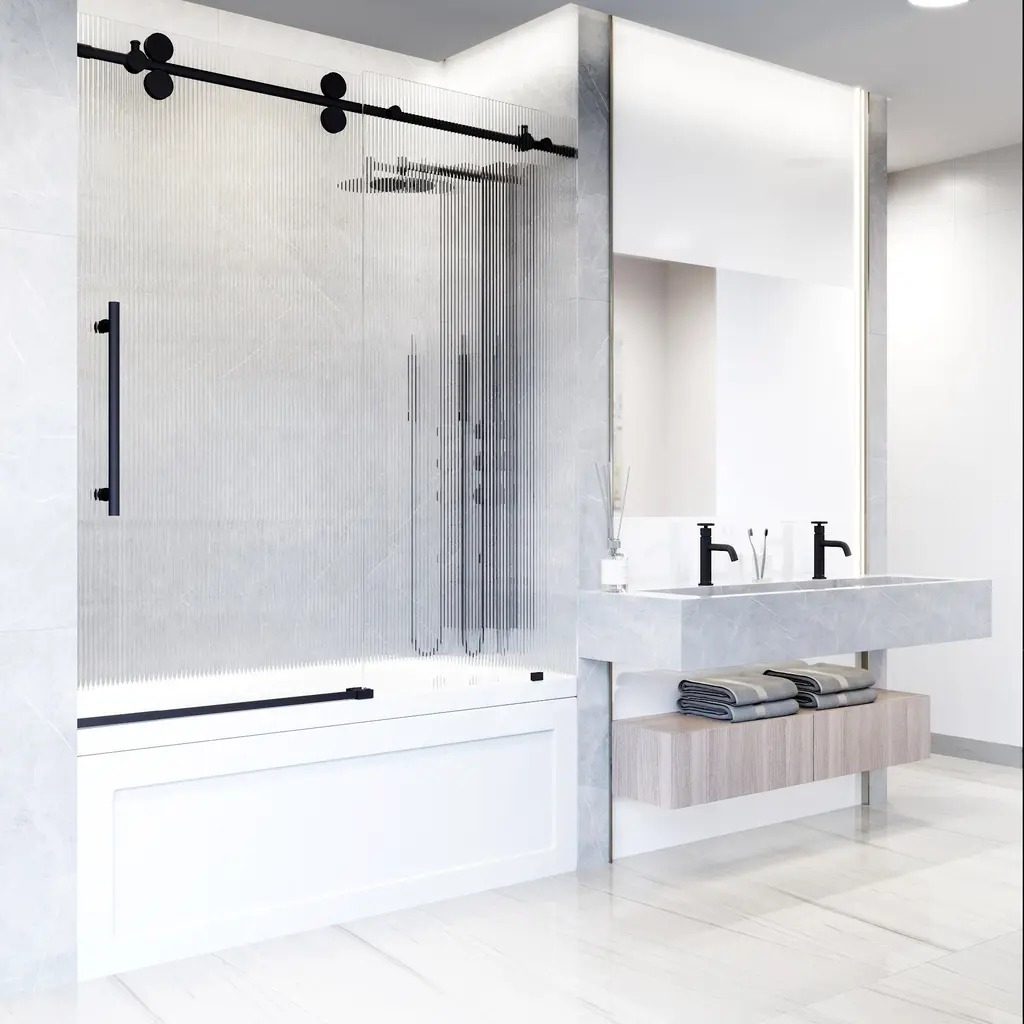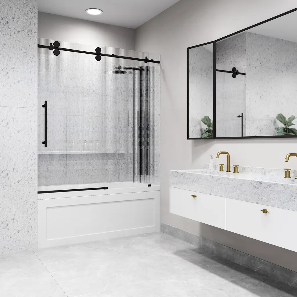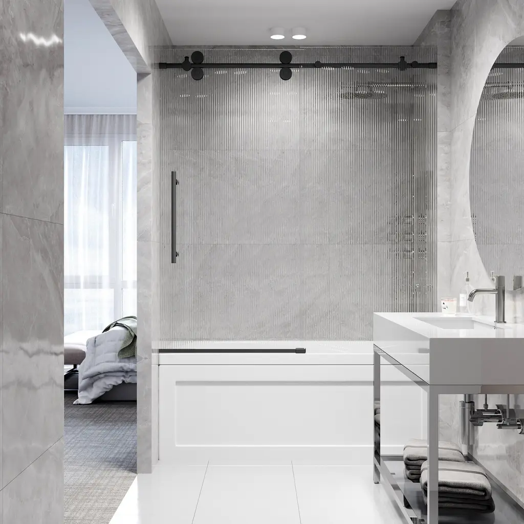 The VIGO Elan Frameless Sliding tub door invites a modern aesthetic to your bathroom with its eye-catching roller disks and a sleek door handle. Crafted with high-quality fluted tempered glass and durable stainless steel hardware, Elan will be an everlasting component of your home. The door supports either a left-side or right-side opening installation. The top rail support allows for wall anchoring to improve stability. The single water deflector redirects water toward the inside of the shower, and the full-length seal strips make the shower waterproof. Its simple instructions allow for an easy, DIY-style installation at home.