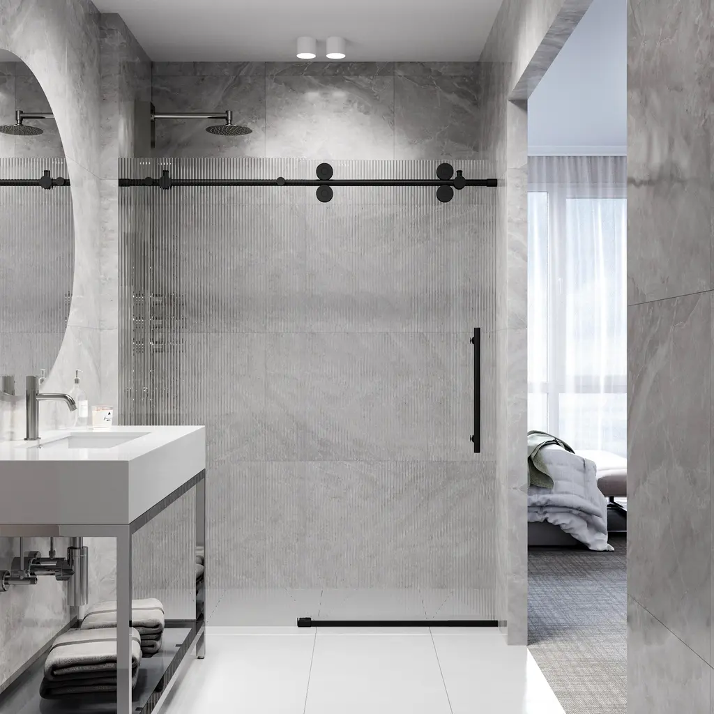 The VIGO Elan Frameless Sliding Shower Door invites a modern aesthetic to your bathroom with its eye-catching roller disks and a sleek door handle. Crafted with high-quality fluted tempered glass and durable stainless steel hardware, Elan will be an everlasting component of your home. The door supports either a left-side or right-side opening installation. The top rail support allows for wall anchoring to improve stability. The single water deflector redirects water toward the inside of the shower, and the full-length seal strips make the shower waterproof. Its simple instructions allow for an easy, DIY-style installation at home. Features: