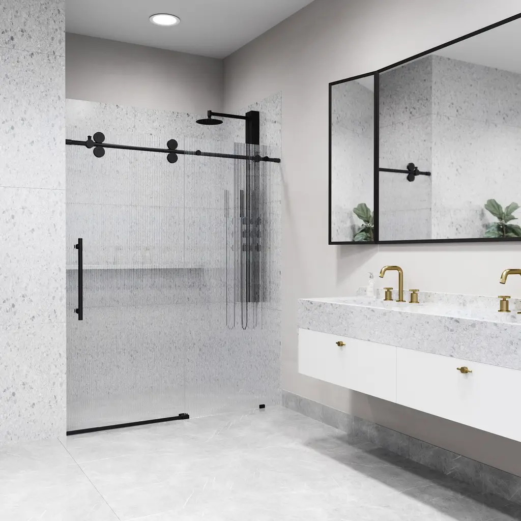The VIGO Elan Frameless Sliding shower door invites a modern aesthetic to your bathroom with its eye-catching roller disks and a sleek door handle. Crafted with high-quality fluted tempered glass and durable stainless steel hardware, Elan will be an everlasting component of your home. The door supports either a left-side or right-side opening installation. The top rail support allows for wall anchoring to improve stability. The single water deflector redirects water toward the inside of the shower, and the full-length seal strips make the shower waterproof. Its simple instructions allow for an easy, DIY-style installation at home.