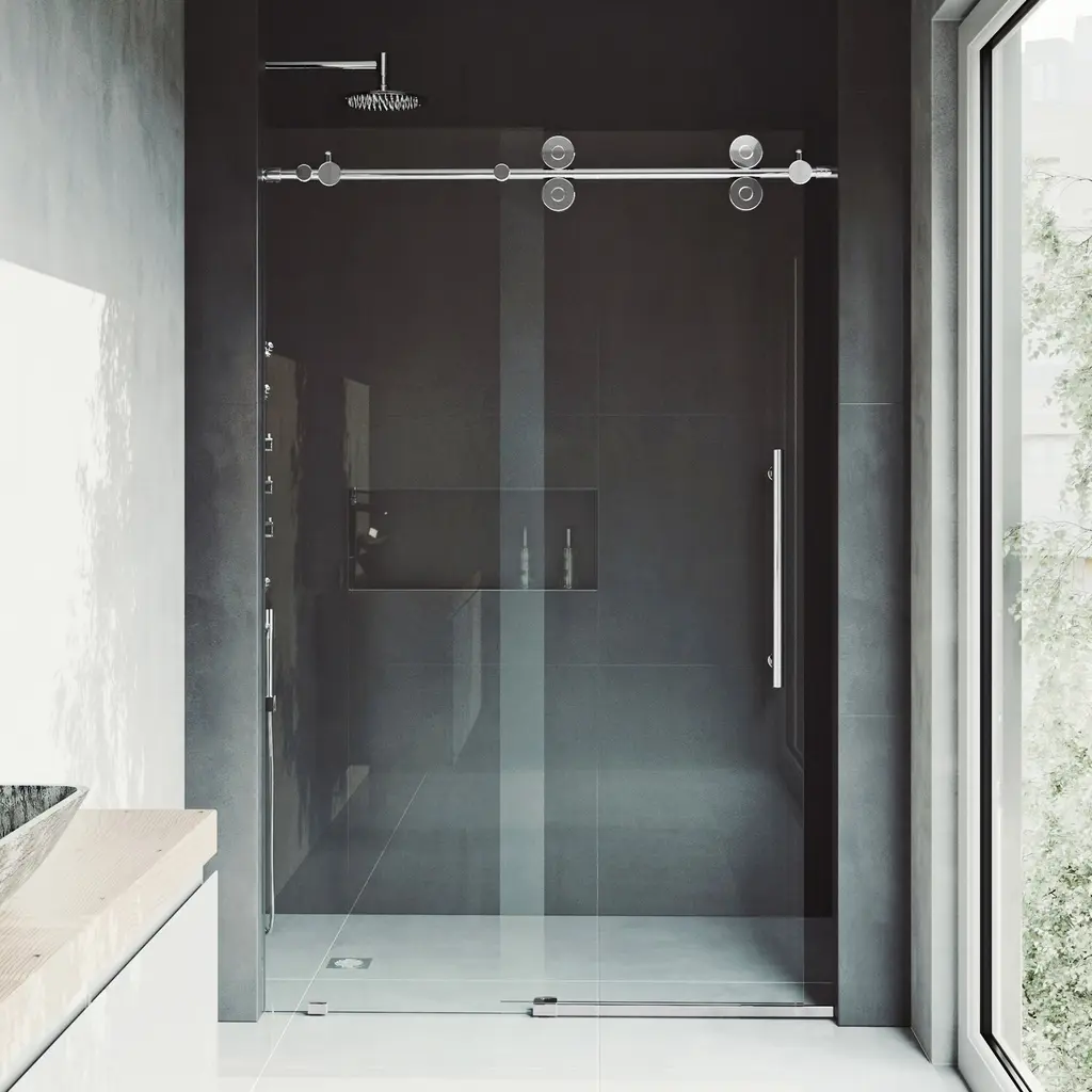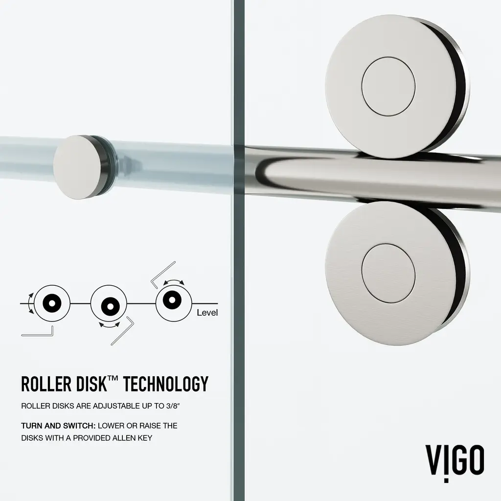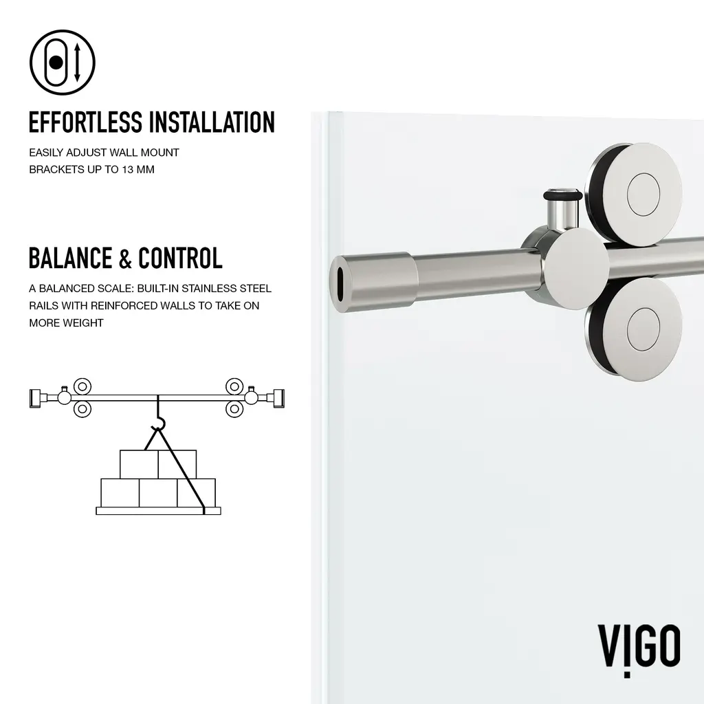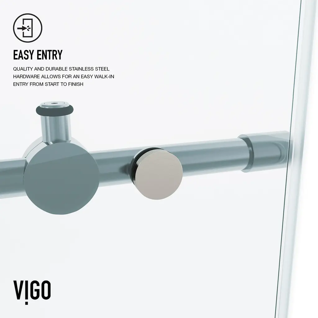The VIGO Elan adjustable frameless shower door is everything you want and need to complete your bathroom remodel. Made with VIGO’s proprietary RollerDisk™ technology, this door has built-in adjustability to ensure that it is a perfect fit in your shower. Flex-Sizing™ and SmartAdjust™ technology ensure that your shower door will remain level despite inevitable shifts that occur as homes settle. This door features resilient tempered glass to prevent dangerous splinters and shards. With the option for right or left-side installation, the VIGO Elan is as versatile as it is sturdy. Stainless-steel hardware outfitted in a 7-layer plated, rust-free finish completes this one-of-a-kind design.VIGO VG60415274 Features:VIGO VG60415274 Specifications: