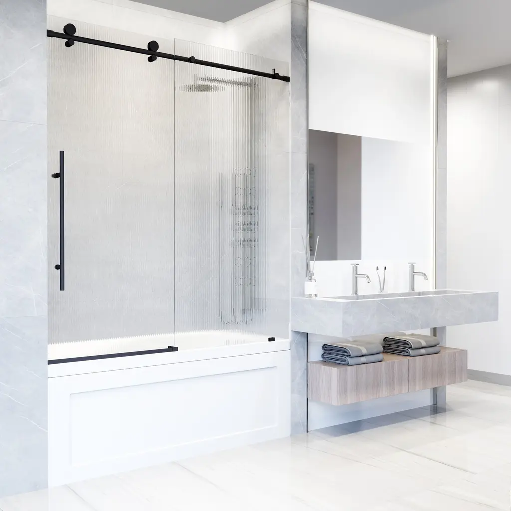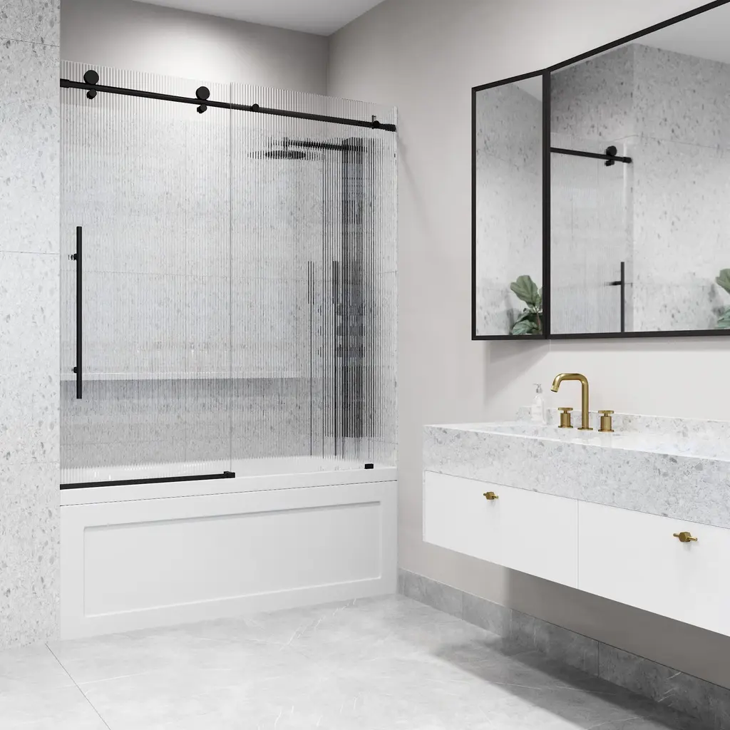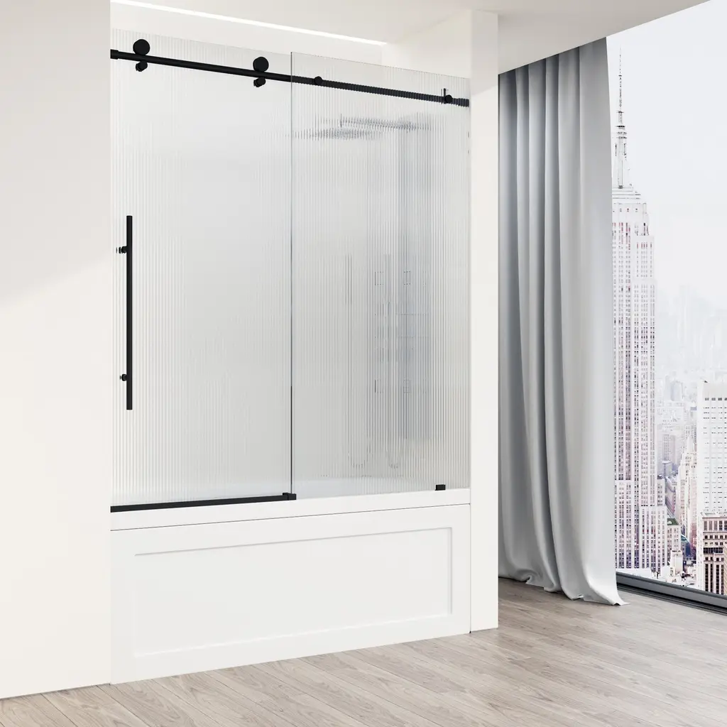 The VIGO Elan E-class is a beautiful Frameless Sliding Bathtub Door. Introduce a modern aesthetic to your bathroom with its premium stainless steel construction and eye-catching roller disks. Crafted with fluted tempered glass and durable stainless steel hardware, Elan E-class will be a long-lasting component of your home. The single water deflector redirects water toward the inside of the tub, and the full-length seal strips make the bathtub waterproof. The simple instructions allow for an easy, DIY-style installation.