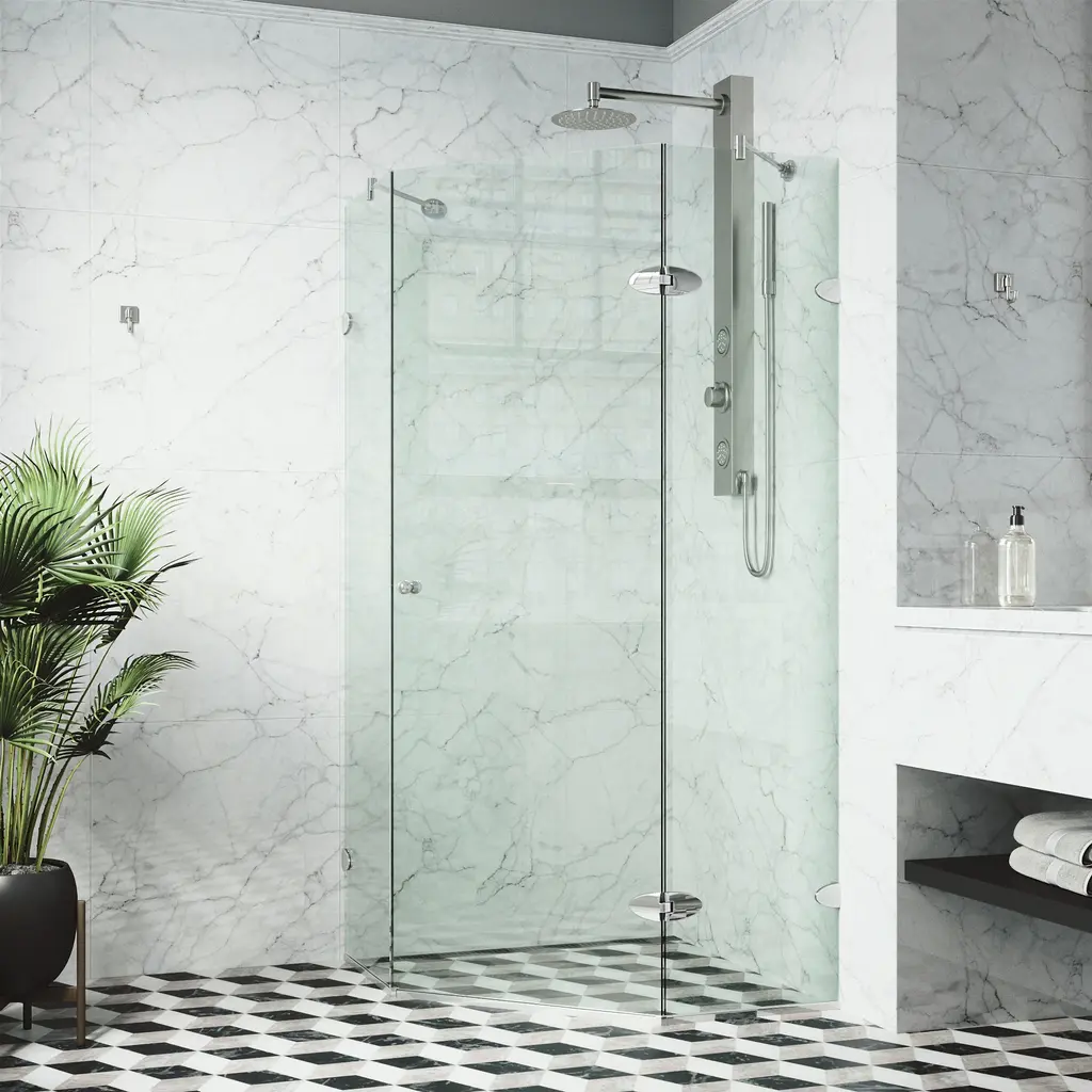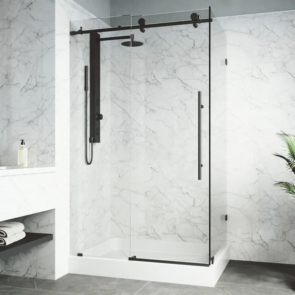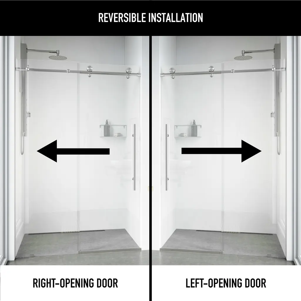 Upgrade your bathroom with the VIGO Elan E-class Shower Door, featuring a sleek and modern design that is sure to impress. The premium stainless steel hardware and proprietary RollerDisk Technology ensure durability and seamless shower entry. This sliding shower system offers exceptional performance and guarantees a relaxing shower experience. With FLEX-SIZING TM and ROLLER DISK TM, this shower door provides adjustability to fit your space and accommodate out-of-plumb walls. The slim top rails and smooth top rollers deliver a quieter shower experience, while the metal threshold prevents water leaks. The high-quality stainless steel hardware easily wipes clean for a lasting sheen, ensuring long-lasting brilliance that resists rust, corrosion and tarnish. Plus, with a reversible installation and frustration-free user-friendly installation guide, this shower door is versatile and easy to install.Features:
