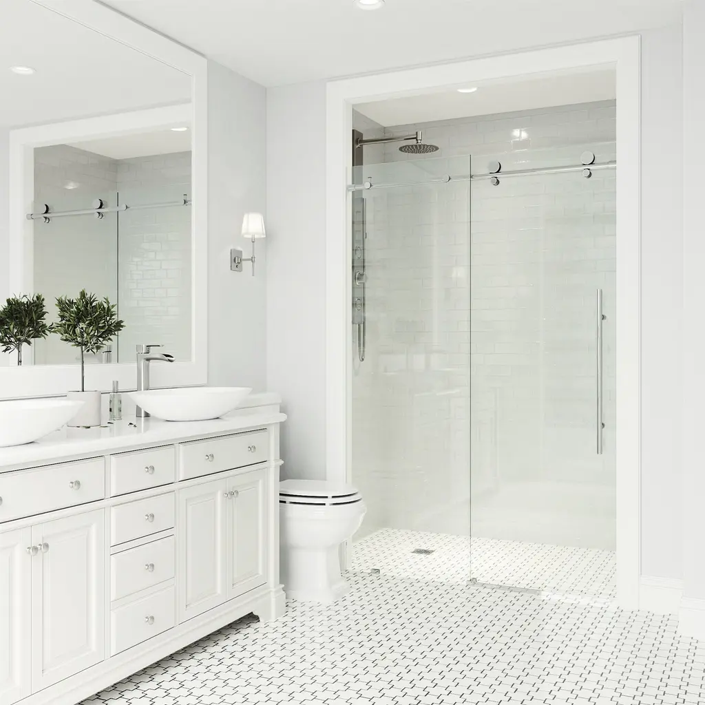 Upgrade your bathroom with the VIGO Elan E-class Shower Door, featuring a sleek and modern design that is sure to impress. The premium stainless steel hardware and proprietary RollerDisk Technology ensure durability and seamless shower entry. This sliding shower system offers exceptional performance and guarantees a relaxing shower experience. With FLEX-SIZING TM and ROLLER DISK TM, this shower door provides adjustability to fit your space and accommodate out-of-plumb walls. The slim top rails and smooth top rollers deliver a quieter shower experience, while the metal threshold prevents water leaks. The high-quality stainless steel hardware easily wipes clean for a lasting sheen, ensuring long-lasting brilliance that resists rust, corrosion and tarnish. Plus, with a reversible installation and frustration-free user-friendly installation guide, this shower door is versatile and easy to install.Features: