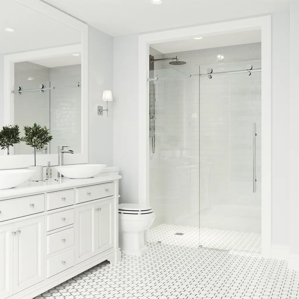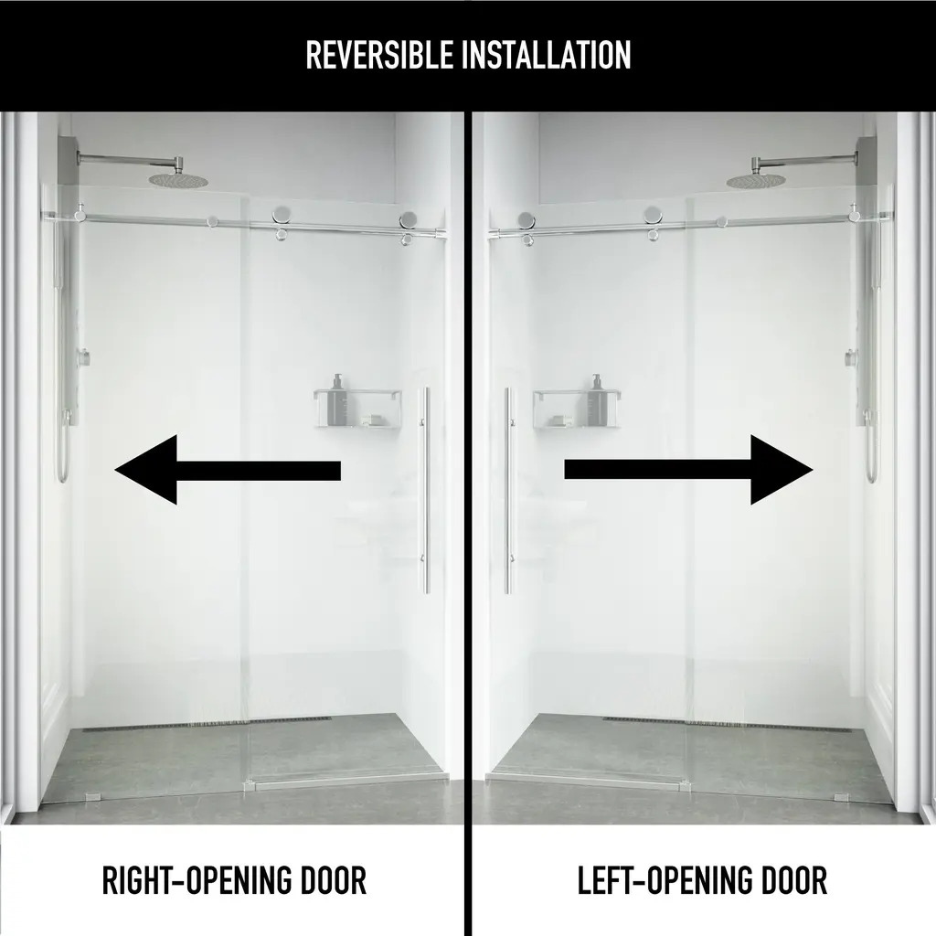 Upgrade your bathroom with the VIGO Elan E-class Shower Door, featuring a sleek and modern design that is sure to impress. The premium stainless steel hardware and proprietary RollerDisk Technology ensure durability and seamless shower entry. This sliding shower system offers exceptional performance and guarantees a relaxing shower experience. With FLEX-SIZING TM and ROLLER DISK TM, this shower door provides adjustability to fit your space and accommodate out-of-plumb walls. The slim top rails and smooth top rollers deliver a quieter shower experience, while the metal threshold prevents water leaks. The high-quality stainless steel hardware easily wipes clean for a lasting sheen, ensuring long-lasting brilliance that resists rust, corrosion and tarnish. Plus, with a reversible installation and frustration-free user-friendly installation guide, this shower door is versatile and easy to install.Features: