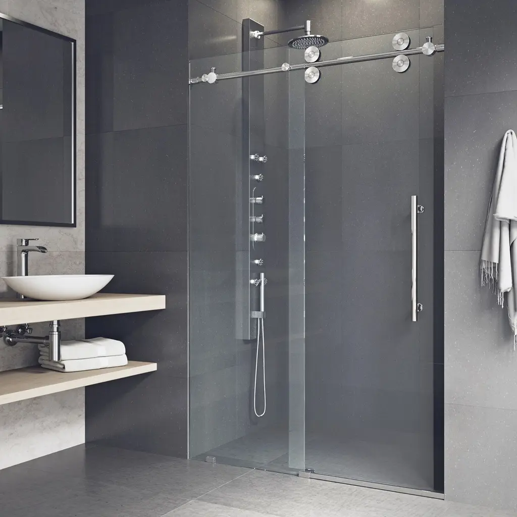 Transform your bathroom into a luxurious oasis with the VIGO Elan Adjustable Frameless Sliding Shower Door. Designed with VIGO's exclusive RollerDisk Technology and SmartAdjust system, this shower door delivers a perfect fit every time, accommodating out-of-plumb walls and shifts that may occur over time. The resilient tempered glass and metal threshold ensure safety and prevent leaks, while the stainless-steel hardware with rust-free finish adds a touch of elegance. With easy walk-in entry and reversible installation, this shower door offers both convenience and versatility.Features:
