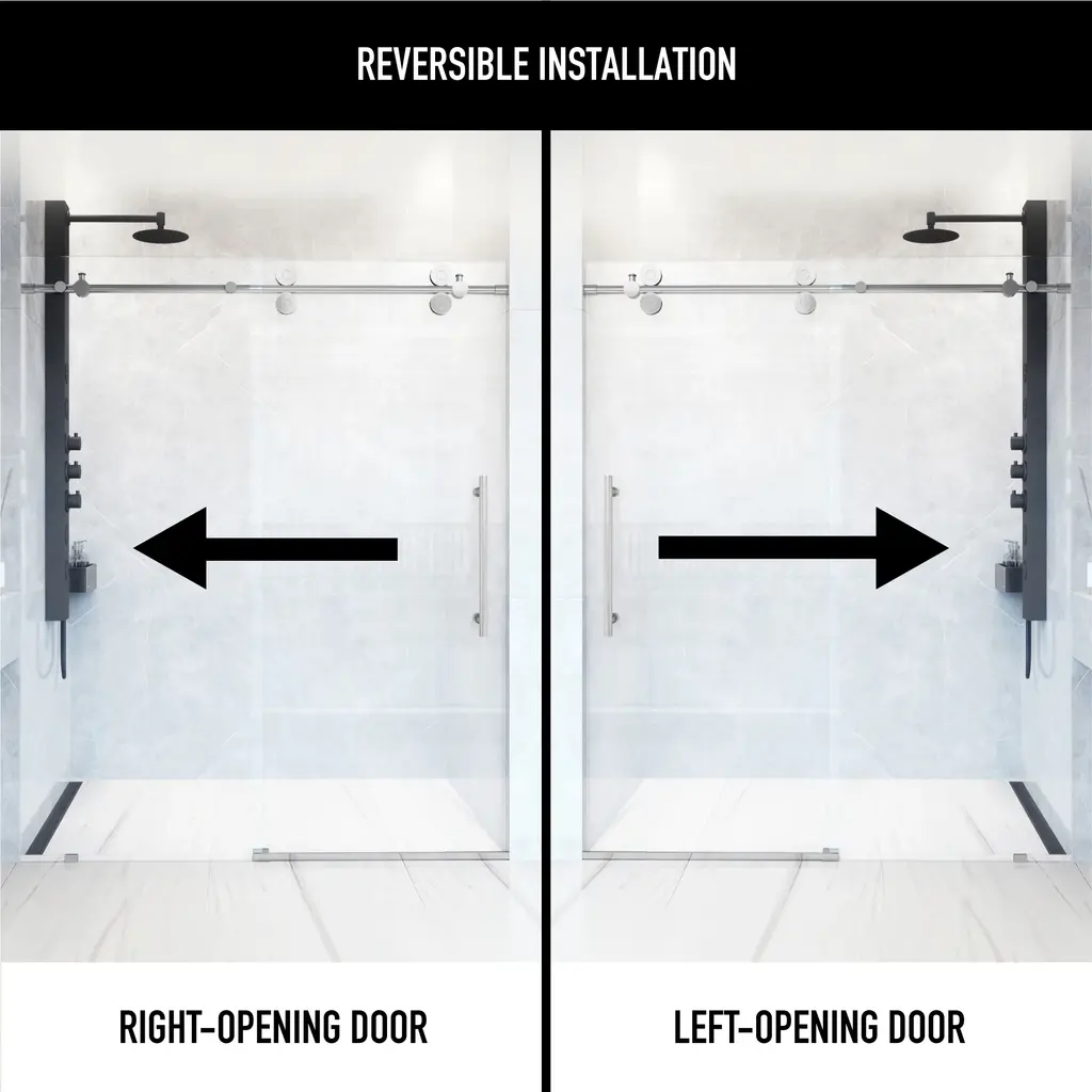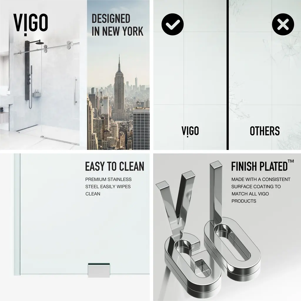 Transform your bathroom into a luxurious oasis with the VIGO Elan Adjustable Frameless Sliding Shower Door. Designed with VIGO's exclusive RollerDisk Technology and SmartAdjust system, this shower door delivers a perfect fit every time, accommodating out-of-plumb walls and shifts that may occur over time. The resilient tempered glass and metal threshold ensure safety and prevent leaks, while the stainless-steel hardware with rust-free finish adds a touch of elegance. With easy walk-in entry and reversible installation, this shower door offers both convenience and versatility.Features:
