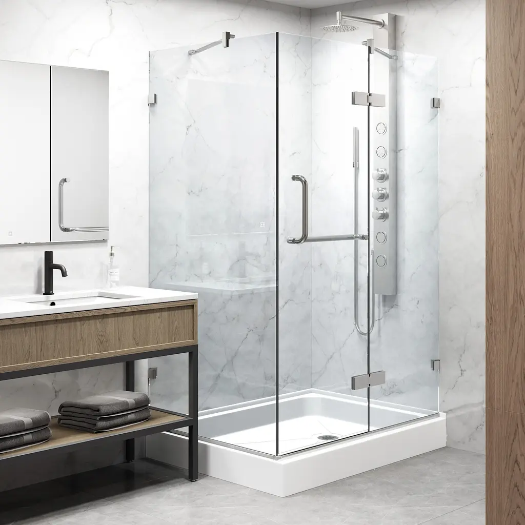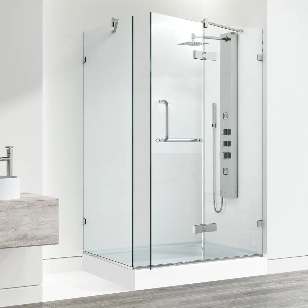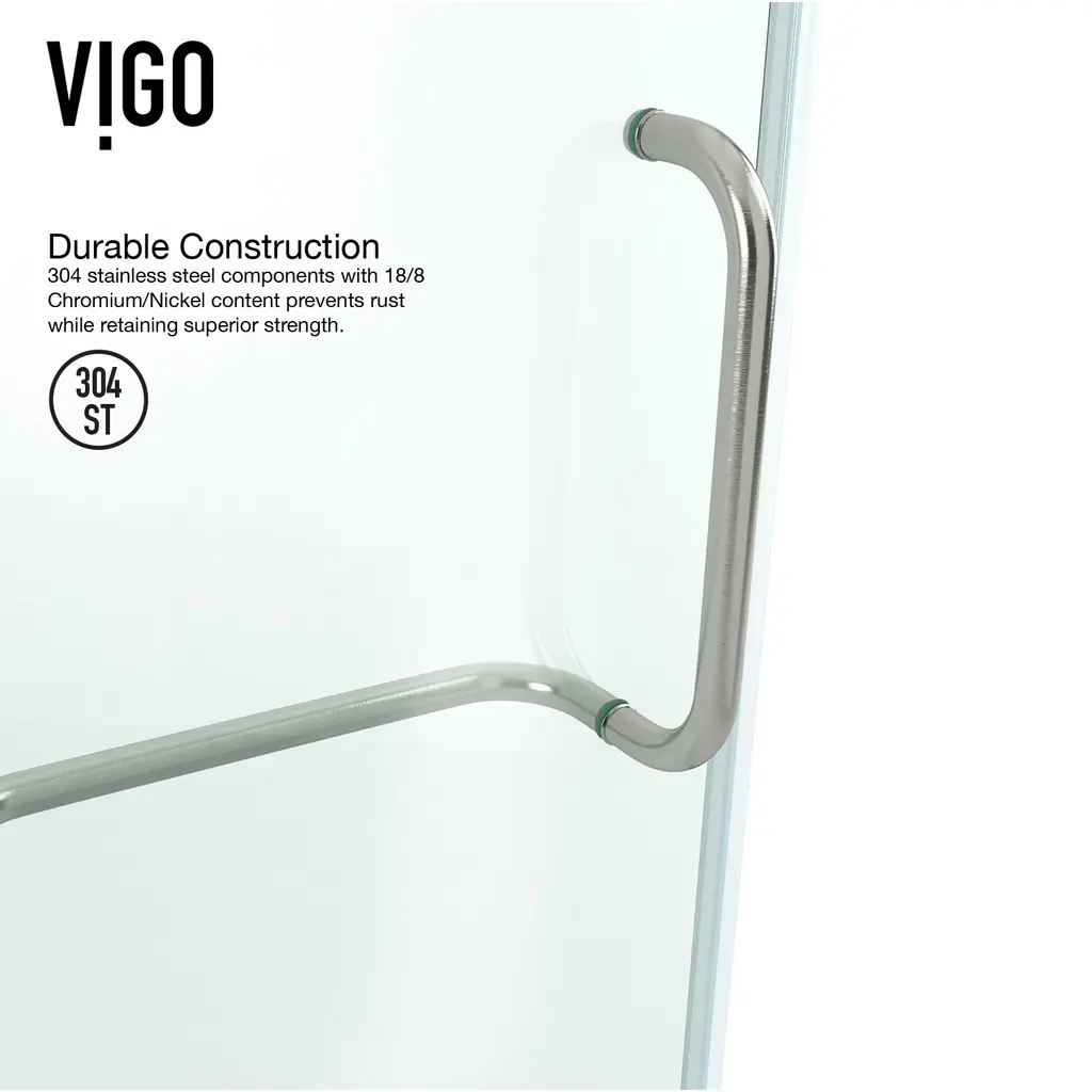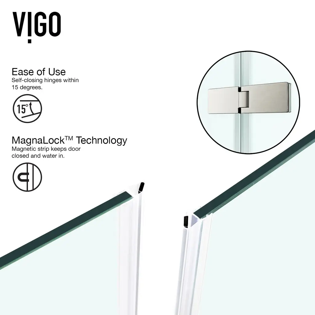 Create the modern bathroom of your dreams with the clean lines of the VIGO Monteray Frameless Shower Enclosure. Solid 3/8" tempered glass, combined with stainless steel and solid brass construction, makes this enclosure strong and long-lasting. The outward-opening door features a convenient towel bar. This model comes complete with an easy-to-clean, right-draining, white shower base.