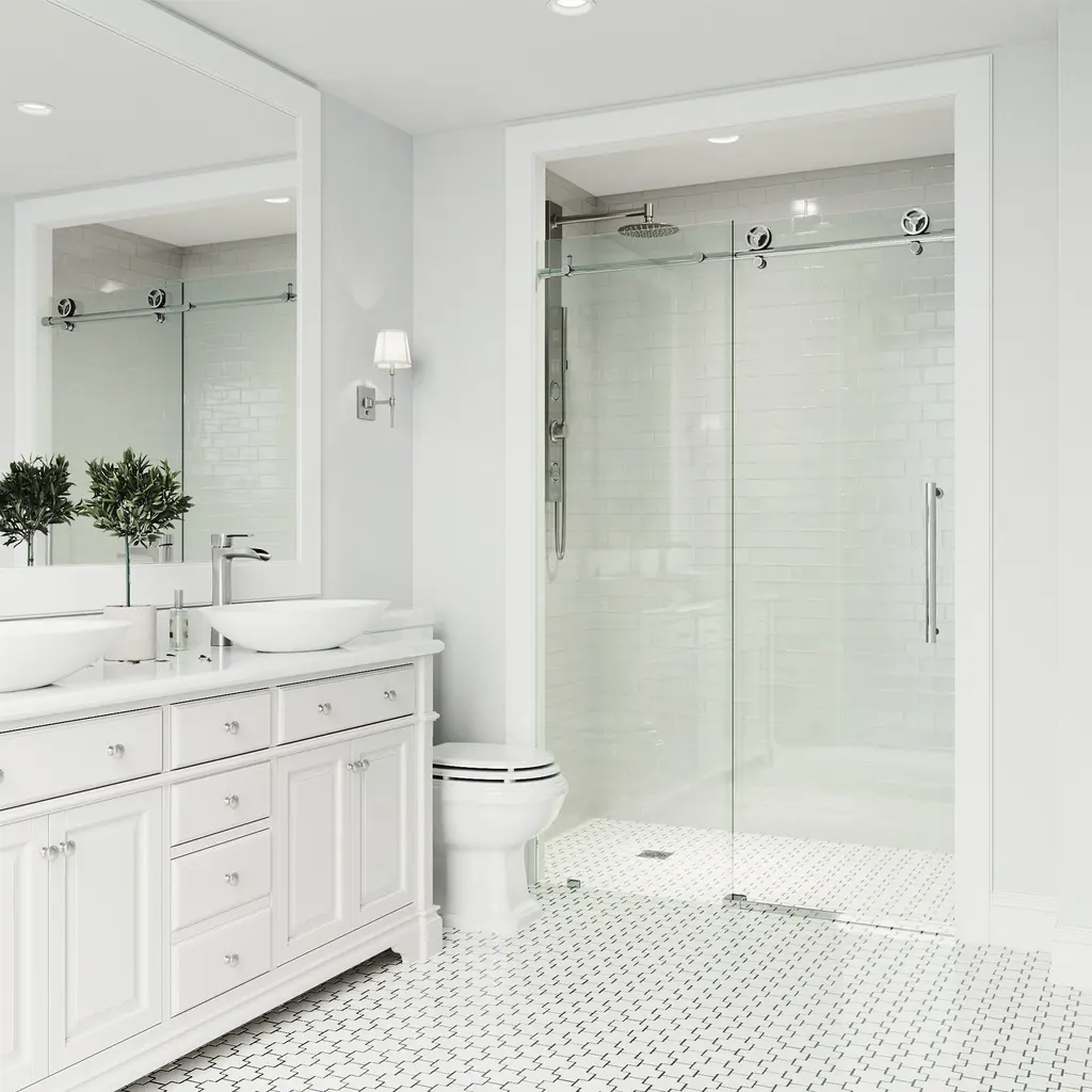 Experience a quieter, more relaxing shower experience with The Cass Collection. With sleek lines, concealed screws, plus elevated heights, The Cass Collection by VIGO is home to a striking shower door. Inspired by the power and silence of the wind, this frameless glass shower door features sleek aerodynamic rollers that deliver smooth, air gliding open and closure. Rich finished hardware details add elegance to high-quality glass doors while the vertical door handle supports inviting walk-in shower entry. Choose between left or right-side opening for a custom installation. Innovative technology features ensure seamless, fast installation and a lifetime of use.Vigo VG6044CL5276 Features:Vigo VG6044CL5276 Specifications: