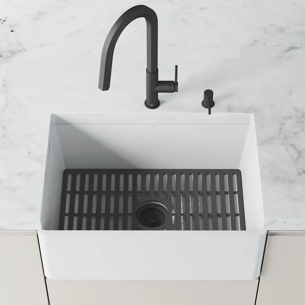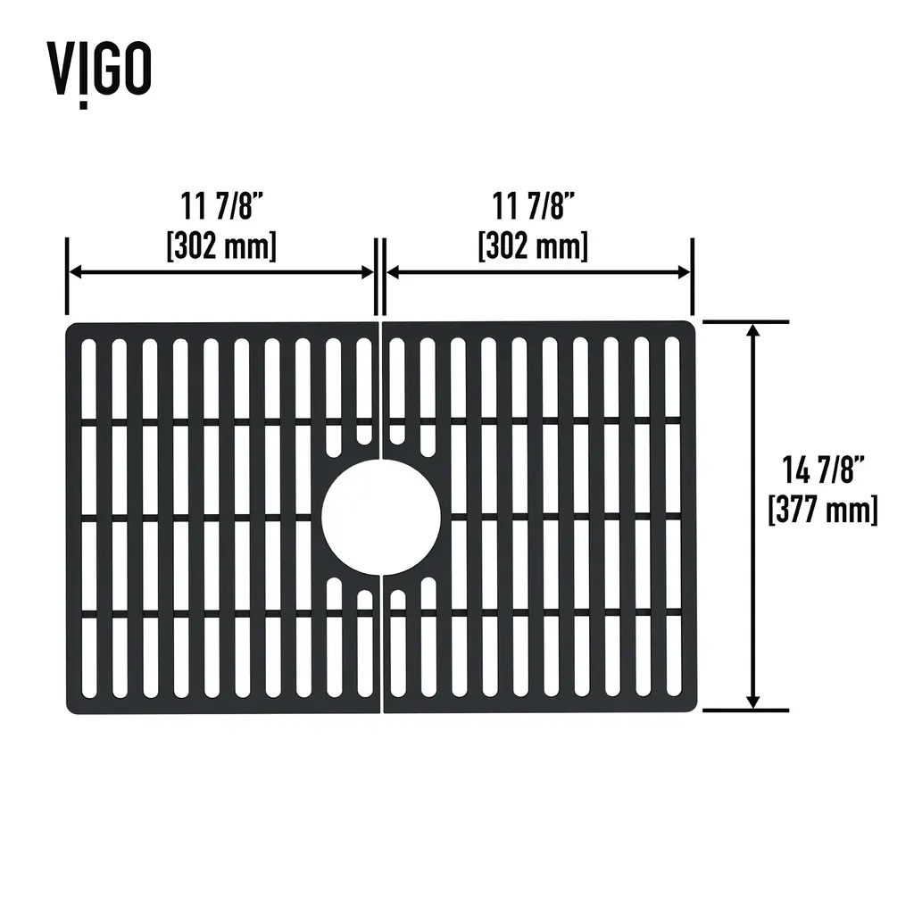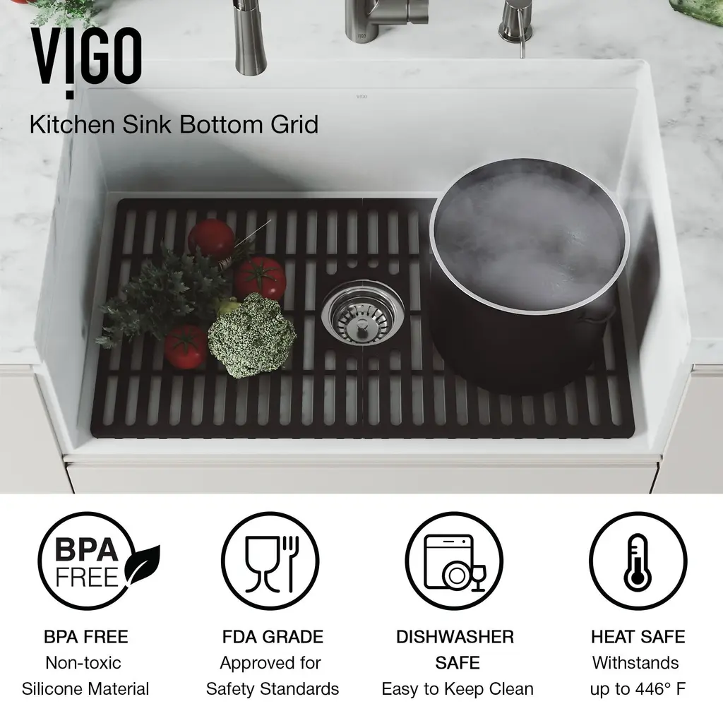 Redefining the traditional kitchen grid, The VIGO Silicone Kitchen Sink Bottom Grid is flexible, foldable, and versatile. Rest the silicone rubber grid inside your sink basin to prevent scratches from pots, pans, dishes, and cutlery. Unlike stainless steel sink grids that are difficult to clean and prone to rust, silicone grids are dishwasher-safe and resists rust for longer function. Thoughtfully engineered, the slotted design helps ensures seamless water drainage. The non-toxic material meets FDA Food Contact Regulations for consumer safety, so you can wash your fruits and vegetables without worry.VIGO VGSG2718 Features:VIGO VGSG2718 Specifications: