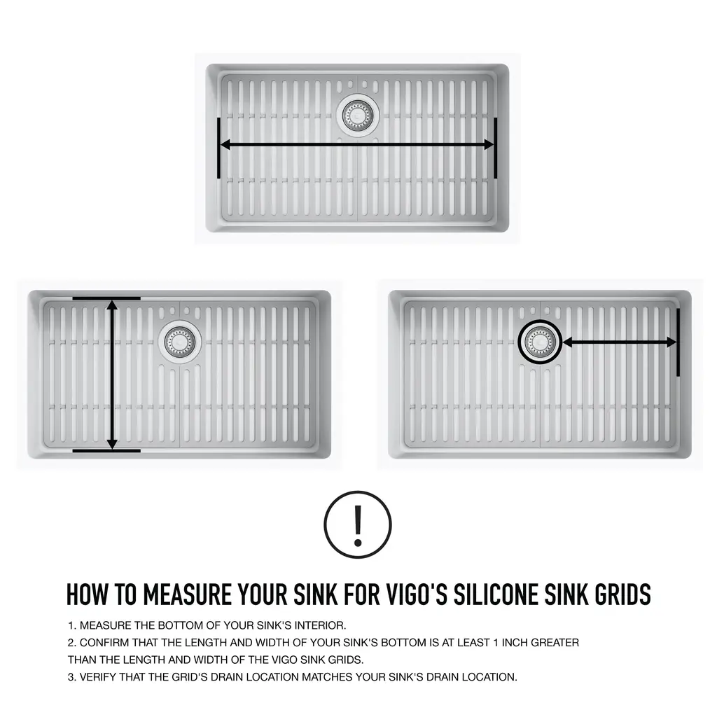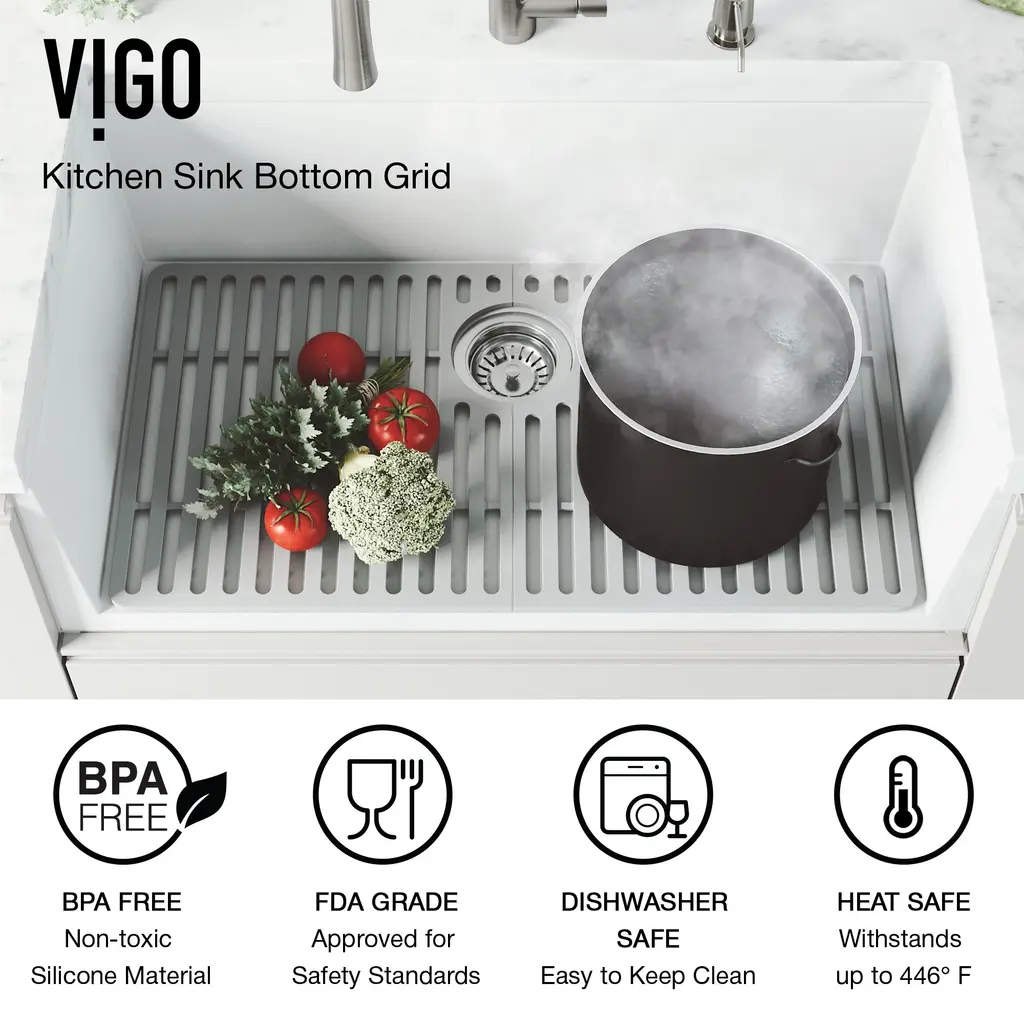 The first of its kind, the VIGO 28 in. Silicone Kitchen Sink Bottom Grid effortlessly protects the surface of your kitchen sink. This flexible rubber model sits inside the sink's basin to prevent scratches from pots, pans, dishes, and cutlery. This grid can withstand high temperatures and easily be cleaned in the dishwasher. Its non-toxic material meets FDA regulations, making it ideal for daily use. Enhance your sink with the VIGO Silicone Kitchen Sink Bottom Grid.Vigo VGSG2815 Features:Vigo VGSG2815 Specifications: