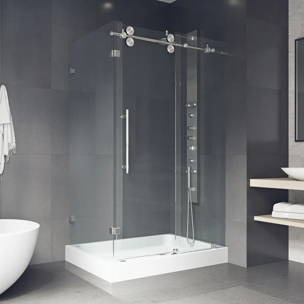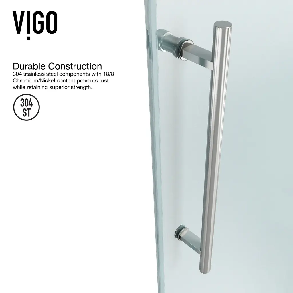Upgrade your bathroom with the sleek and modern VIGO Frameless Clear Shower Enclosure. Made with durable stainless steel and 3/8" tempered glass, this shower enclosure is built to last. The sliding door can be installed to open left or right, while the RollerDisk™ Technology allows for adjustability. With rust-free hardware and scratch-free finishes, this shower enclosure is not only beautiful, but also highly functional and safe.Features: Other sections: