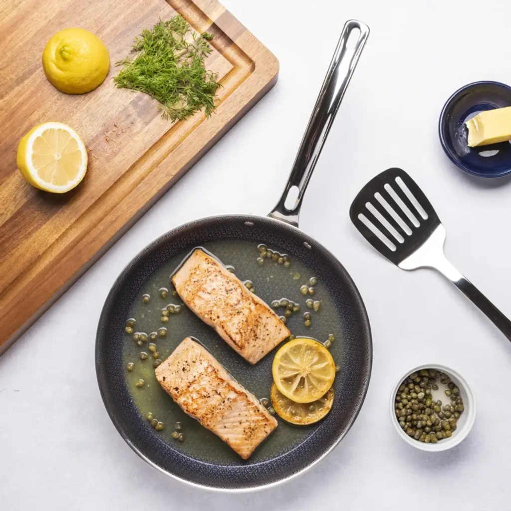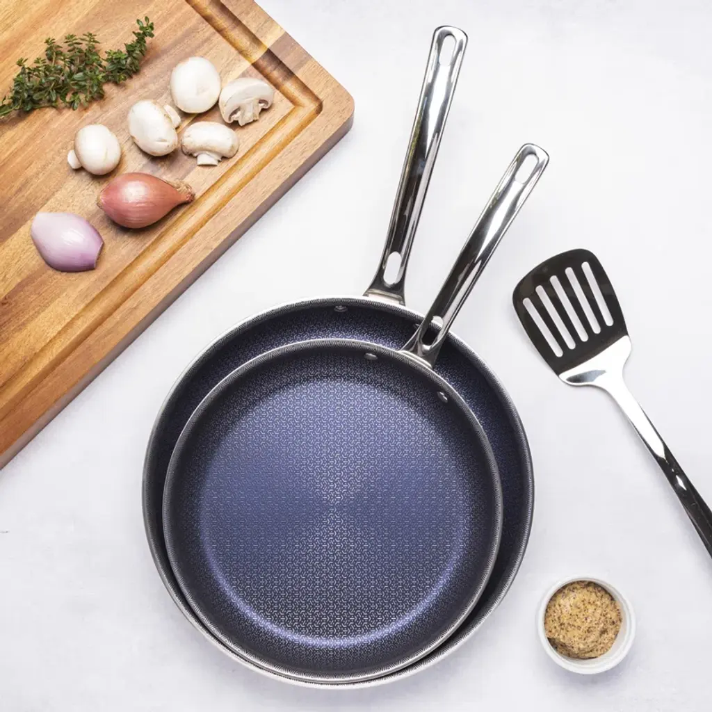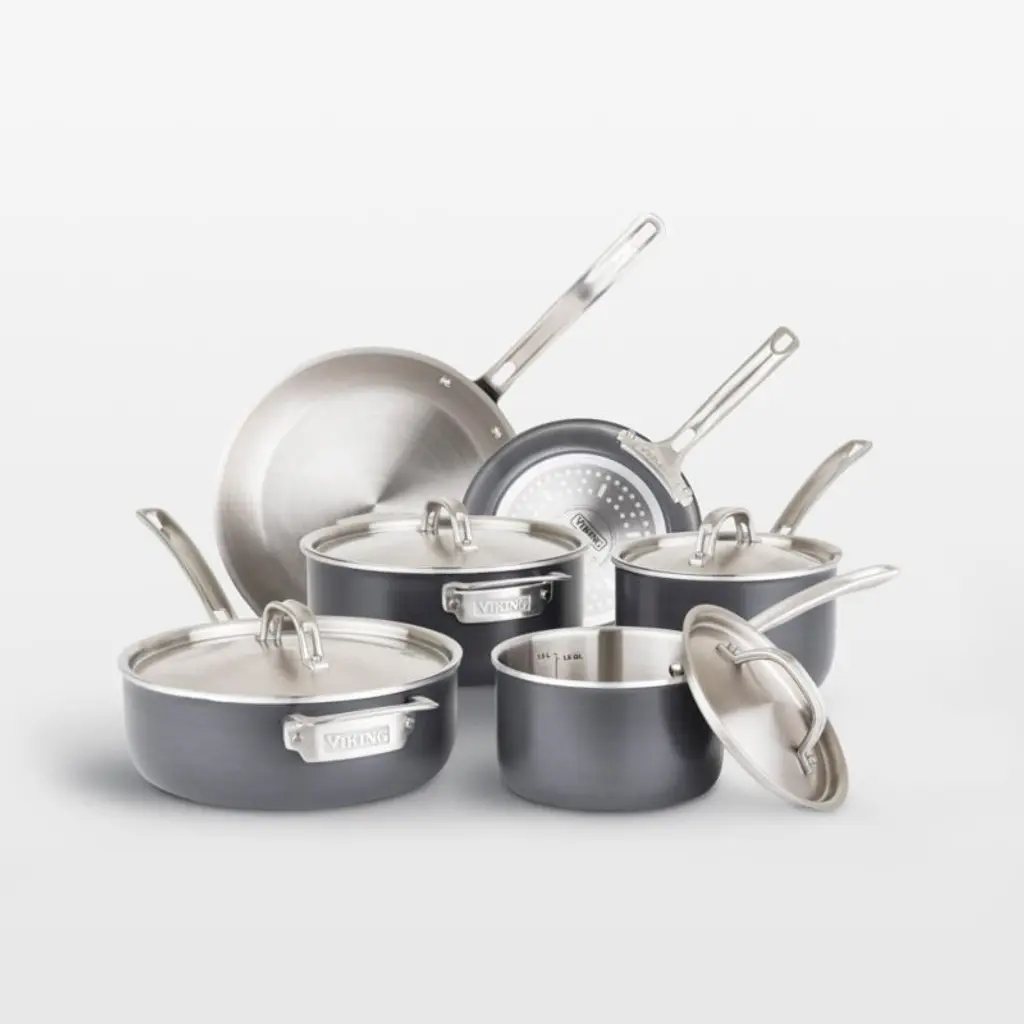 This heavy-duty, 15 piece Stainless-steel cookware provides heating, which reduces the need for using high temperatures. While they aren't nonstick, following the included directions lets you learn how to season and use the pans for easier cleaning. The flared edges let you stir the entire contents easily for less sticking and cold spots. Use the vented lids to prevent boil overs when cooking dishes with liquids. The lids are see-through, making it easy to see what's going on inside the pot without removing the cover and losing heat during the cooking process. The pots feature volume markings inside for easier measuring. Surgical grade Stainless Steel Interior and Exterior, increases efficiency and gives each pot and pan a mirror finish. The 15-Piece set includes: 8” fry pan, 10" Fry pan, 2.25qt sauce pan with lid, 3.3 qt sauce pan with lid, 4 qt small soup/ stock pot with lid, 5.2-quart sauté pan featuring a helper handle and lid, 8-quart stock pot and lid, a stainless steel colander strainer and 2 Hybrid Plus Fry Pans in 9.5 and 11 inches. This product contains: PFAS, Iron, Chromium, Nickel, and Manganese For more information about PFAS and other chemicals in this product, visit www.vikingculinaryproducts.com/pages/disclosures.html Para obtener más información sobre PFAS y otras sustancias químicas en este producto, visite www.vikingculinaryproducts.com/pages/disclosures.html