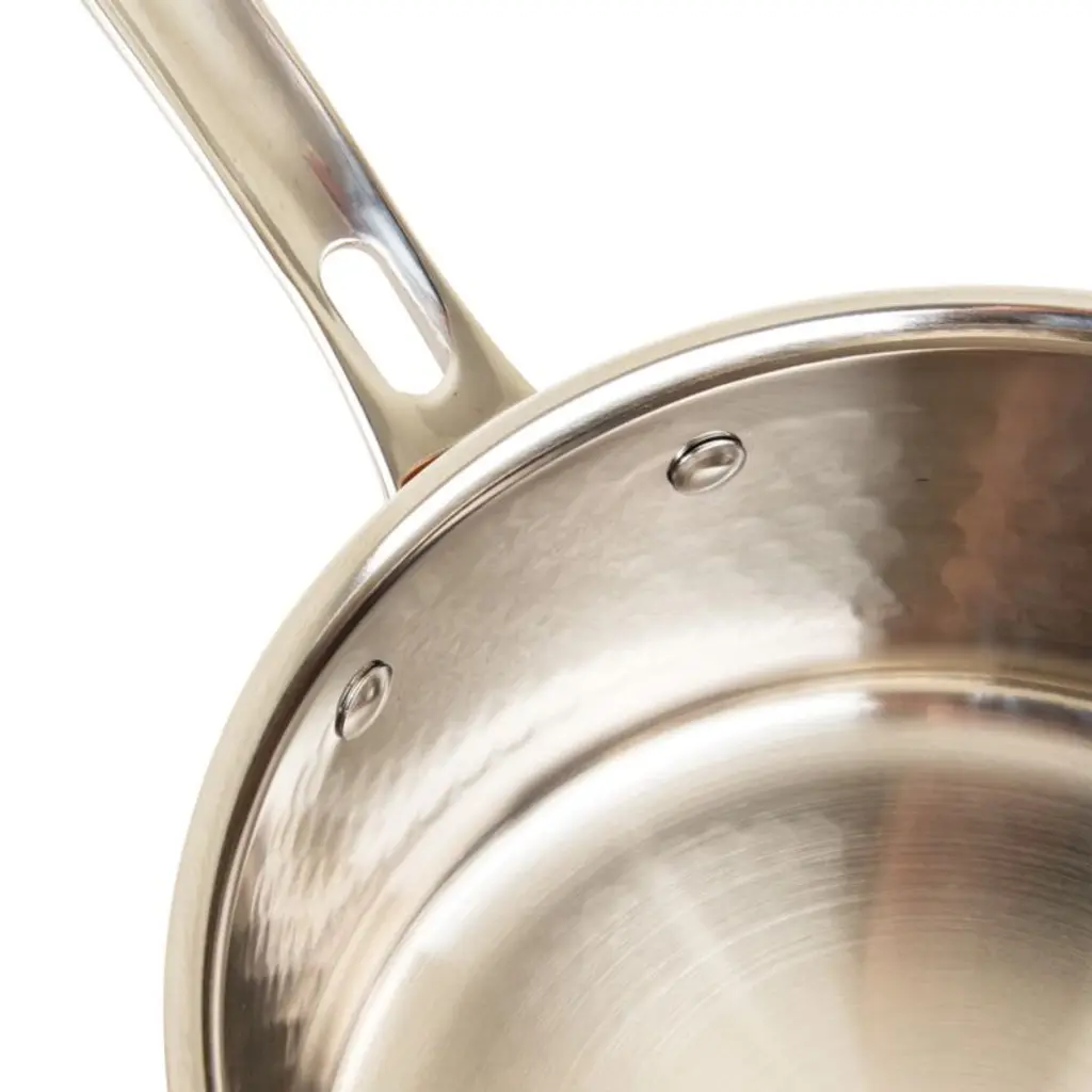 Hammered copper cookware stuns on your stovetop, pot rack or dining table. Reimagining a timeless classic for the modern kitchen, this 10-piece set combines the beauty and conductivity of copper exteriors with non-reactive stainless steel cooking surfaces and lightweight, conductive aluminum cores. The pans boast stay-cool handles, flared rims and glass lids for ease of use.