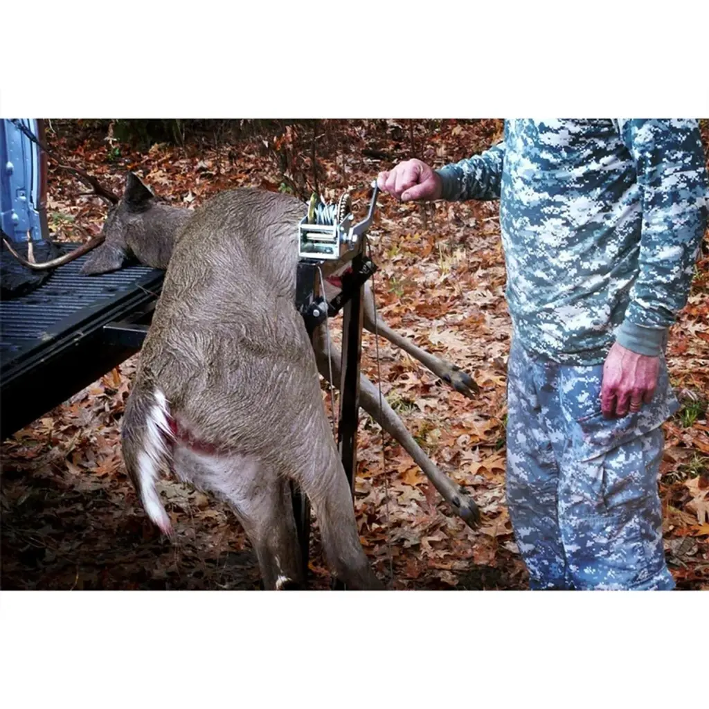 Transport large game without straining your back with the L-E-VATOR Loading Assistant from Viking Solutions. The Viking Solutions L-E-VATOR is the fastest and simplest solution to loading your deer onto an ATV, UTV, or pickup! This new product is lightweight, transportable, and sets up in 1 minute or less. To use, simply unfold the feet and the lifting arms, push the support cables into their slots on the feet, lower the arms and push the deer on, then crank away! This product was designed for ease of use and is an affordable solution to manually transporting your kill. The L-E-Vator features a durable powder coat finish that is weatherproof and will last for years. With a 300-pound weight capacity, you can transport fairly large game with ease. You don’t need a strained back (or worse) from loading a deer. Use the Viking Solutions L-E-VATOR to experience convenience when dealing with heavy loads on your next hunting trip.