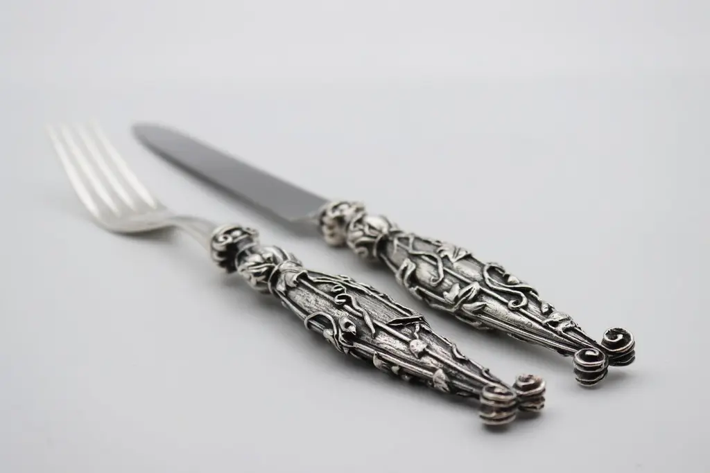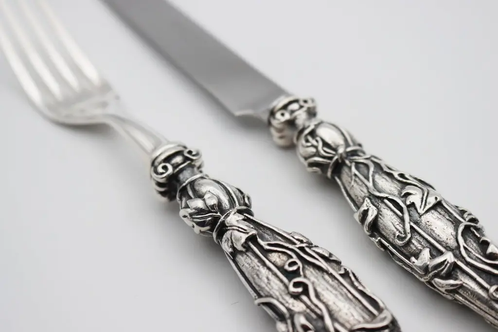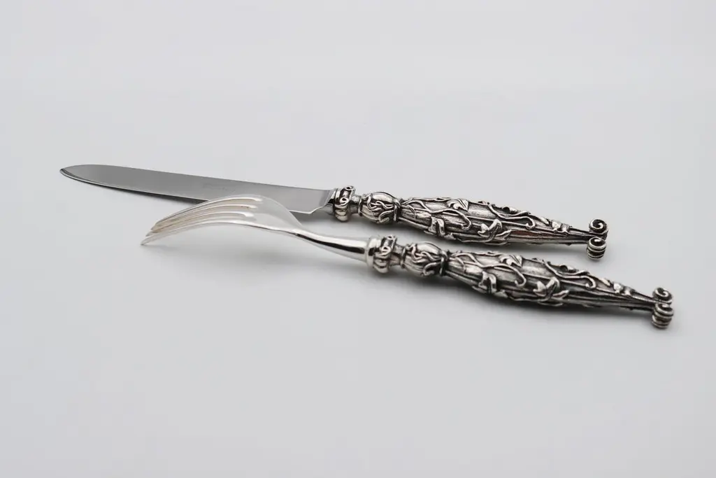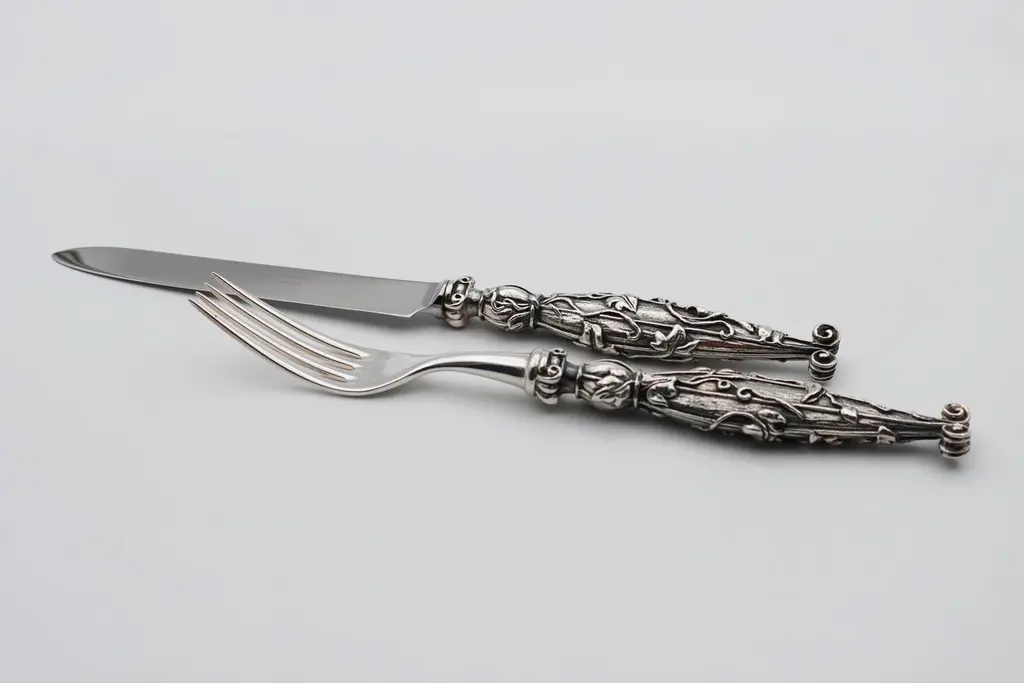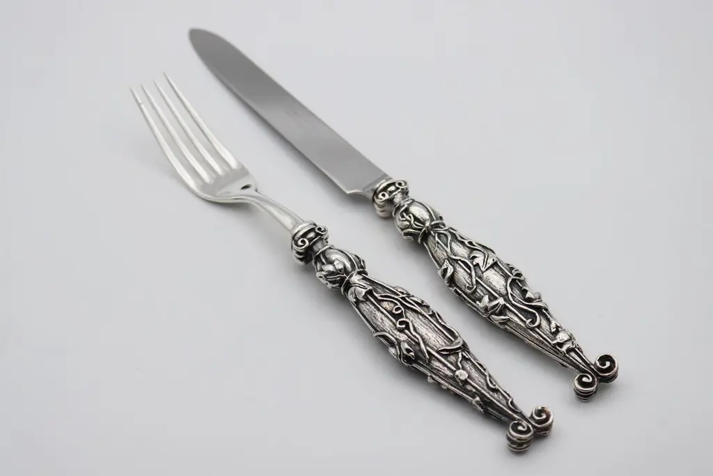 VILLA D’ESTE Set of 2 pieces in Silver Bronze or Gold BronzeSet of 2 pieces (table forks/fish, table knife or meat/fish knife) in silver bronze 35/42 micronsIt is possible to order all products separately or set of 4 pieceTable spoonTable forkTable knife/meat knife Fish knifeFish fork Dessert/cake/juice/tea-coffee spoonDessert fork Dessert knifeThese pieces are the handmade work of French designer Richard Lauret.These pieces are unique OR made to order.The products can be personalised with customised engraving (price on quotation).In the same collection are presented SERVICE PIECES, TABLE ACCESSORIES, INDIVIDUAL COVERS.