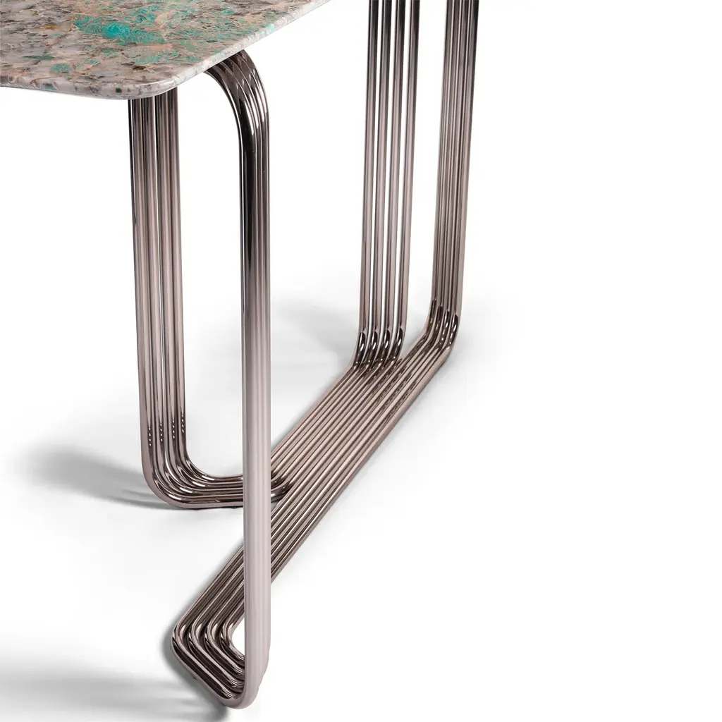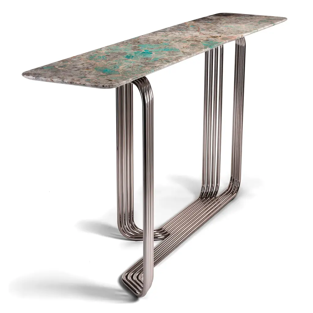 The Vincent console features a structure made of chromed metal tubes, curved and welded together for a sleek design. The top is a bevelled Amazonite marble slab, equipped with liner jig bushes for secure installation. It is designed for wall mounting using a specific bracket beneath the top. The metal parts are finished in shiny Siena for a touch of elegance.