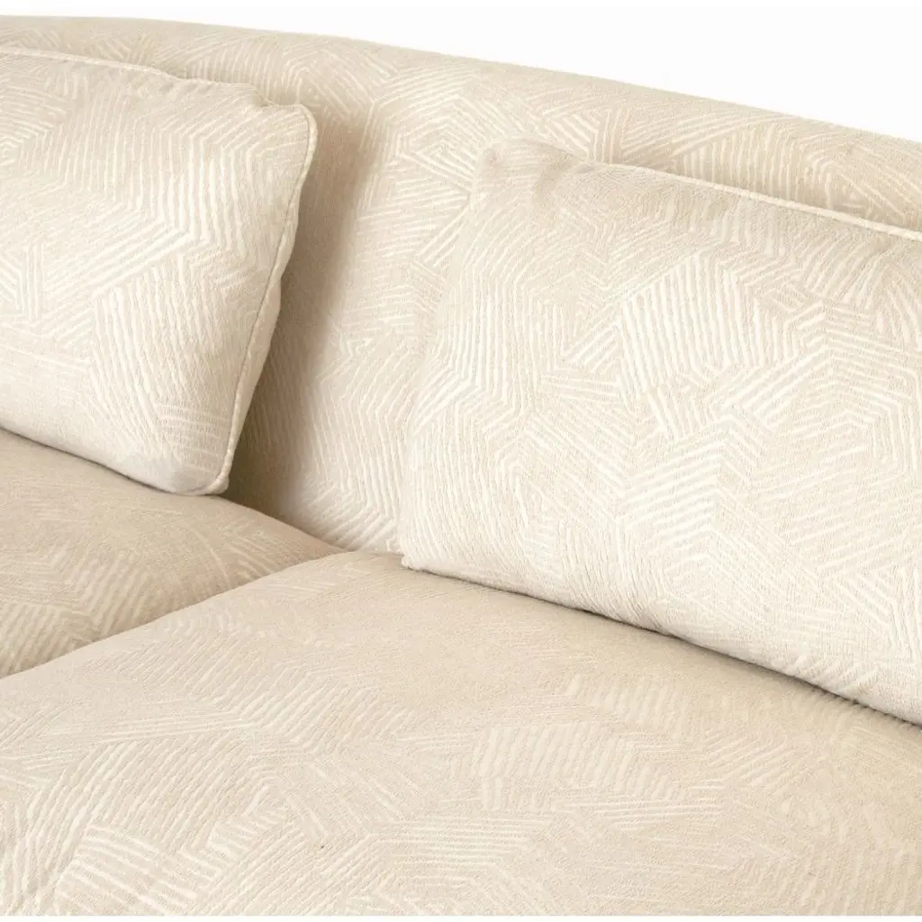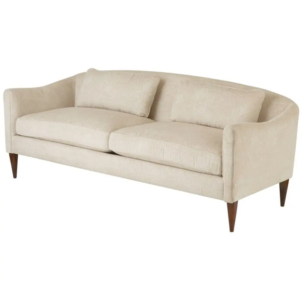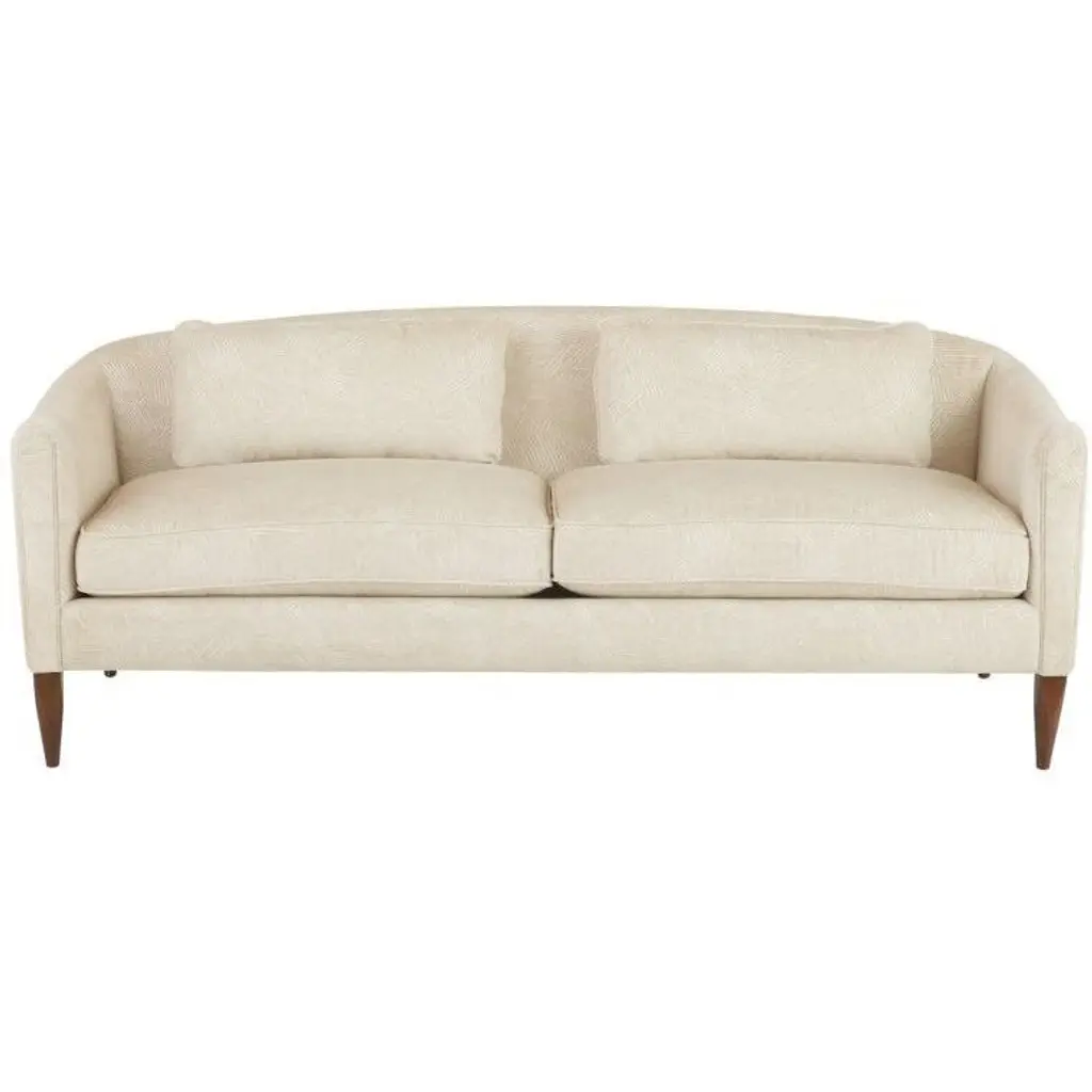 An update of one of our classics, the Vincent sofa was inspired by a vintage Parisian find. Refreshed in a textured ivory tone-on-tone fabric with welting details to accentuate its curves, the matching back cushions are made a little smaller to create a playful imbalance. Sits on dark walnut-finished wooden legs. Finish will vary.