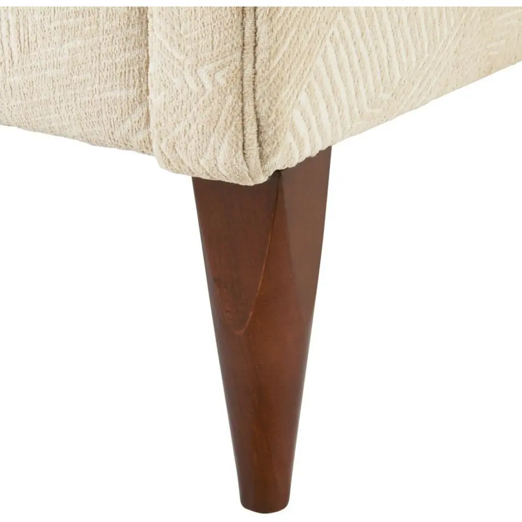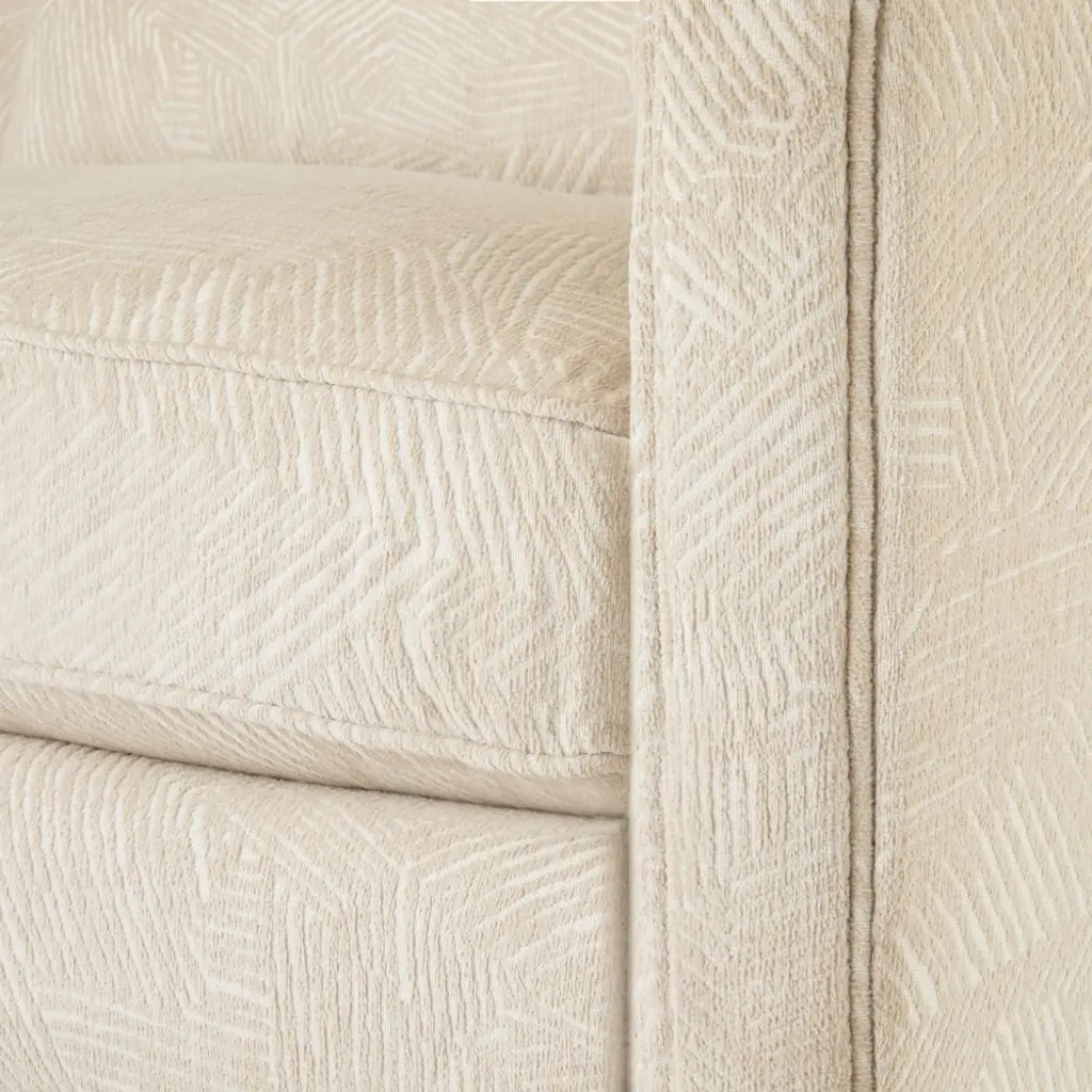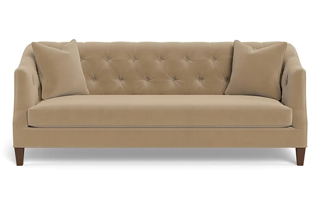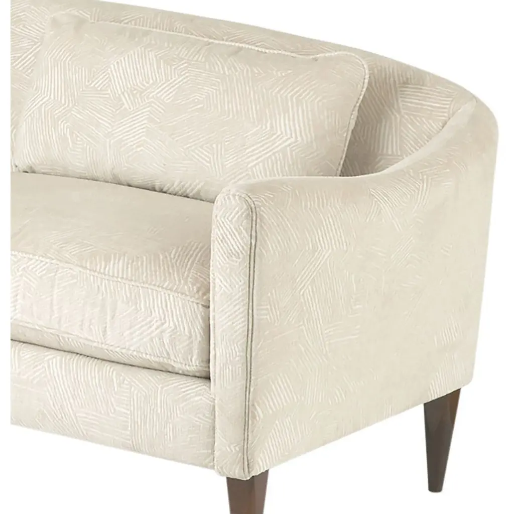 An update of one of our classics, the Vincent sofa was inspired by a vintage Parisian find. Refreshed in a textured ivory tone-on-tone fabric with welting details to accentuate its curves, the matching back cushions are made a little smaller to create a playful imbalance. Sits on dark walnut-finished wooden legs. Finish will vary.