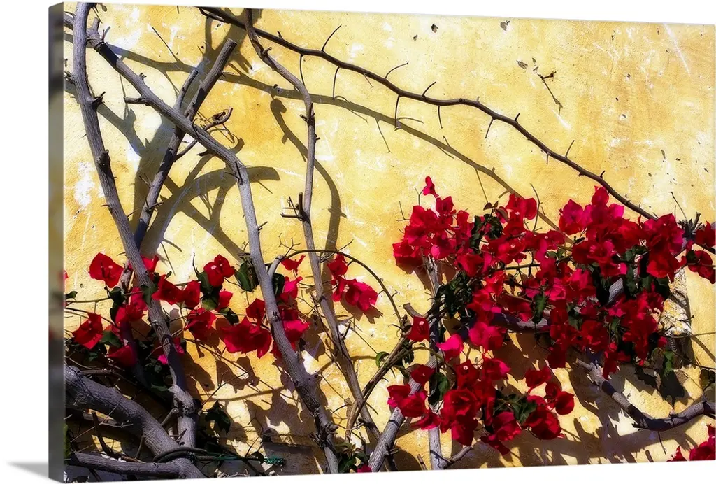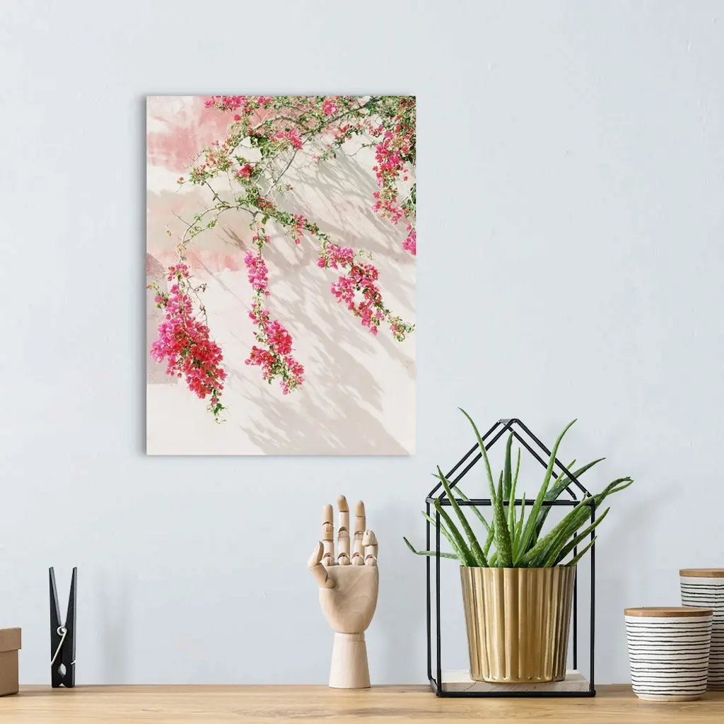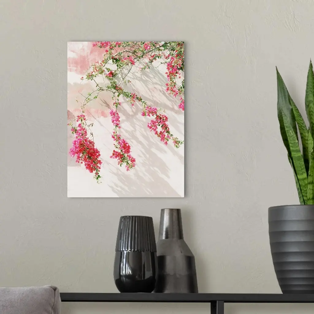 Photograph of bright pink flowering stems against a white wall, Santorini, Greece.