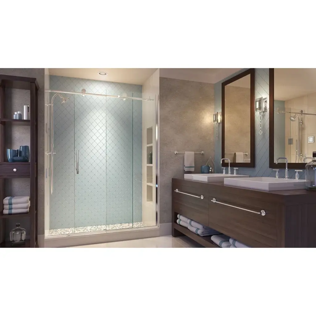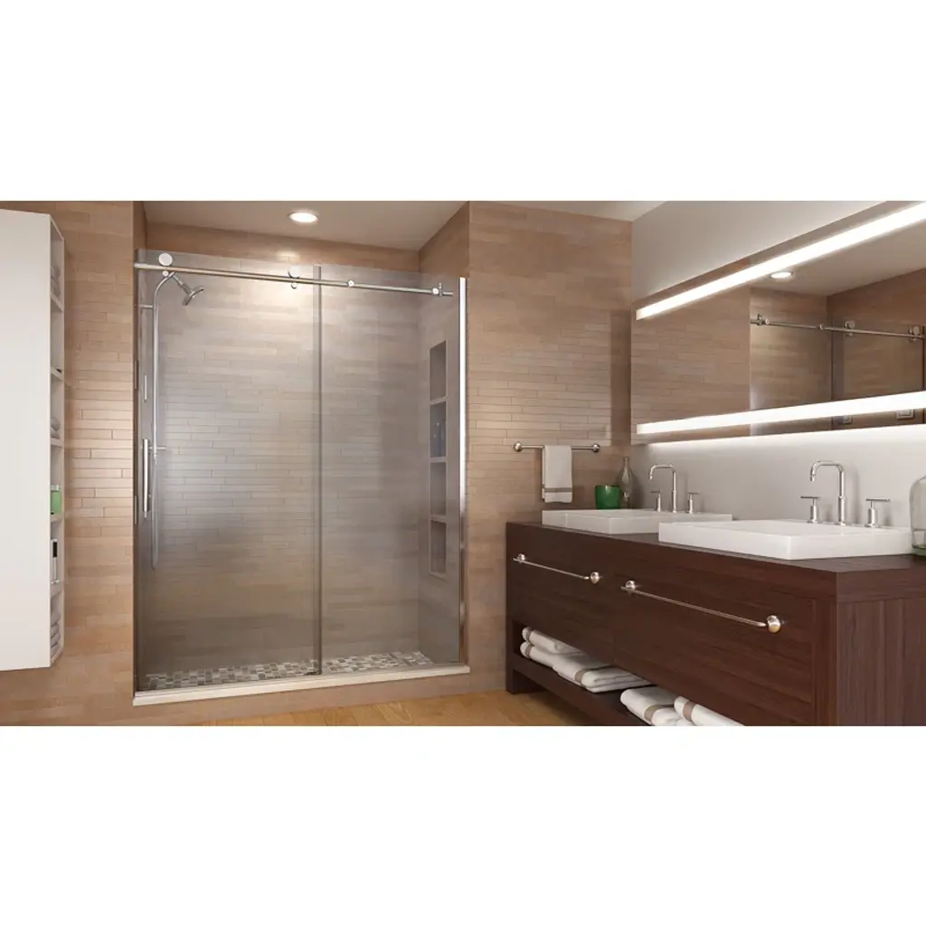 The Vinesse Series provides the perfect balance of beauty, function, and affordable luxury. Developed specifically to fit today’s most popular shower openings, the urban style double or single rolling design makes it the ideal solution when space is at a premium. 3/8 inch heavy tempered glass provides a smooth experience when rolling the door with a 13-inch handle industrial handle. The exposed header gives a suspended look, which contains a large roller at the top and a small roller at the bottom.