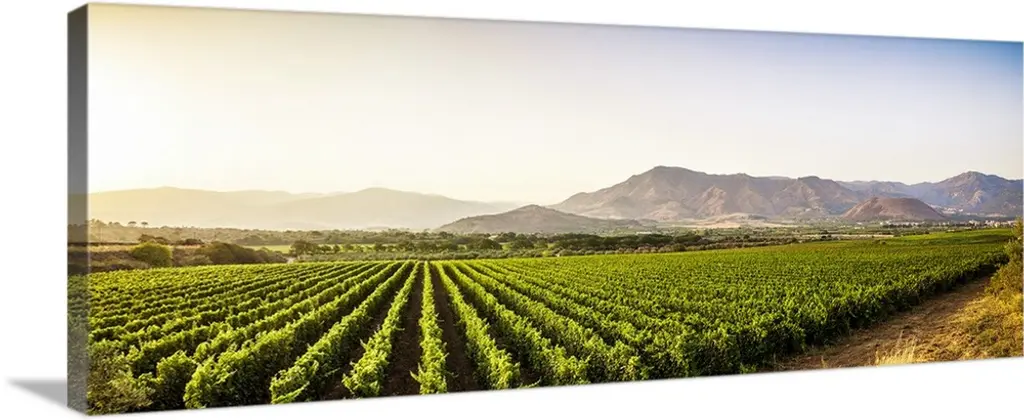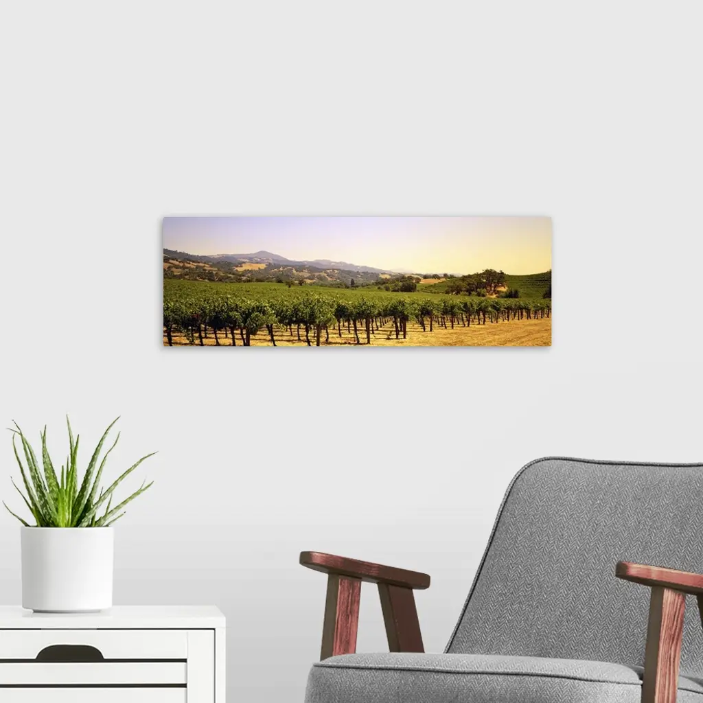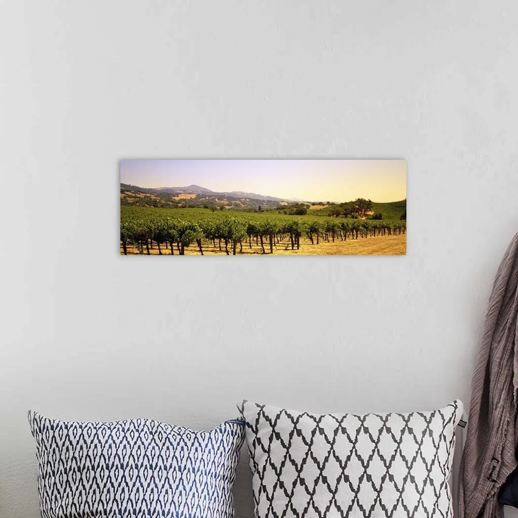 A panoramic view of a large vineyard that reaches far back with hills photographed in the background.