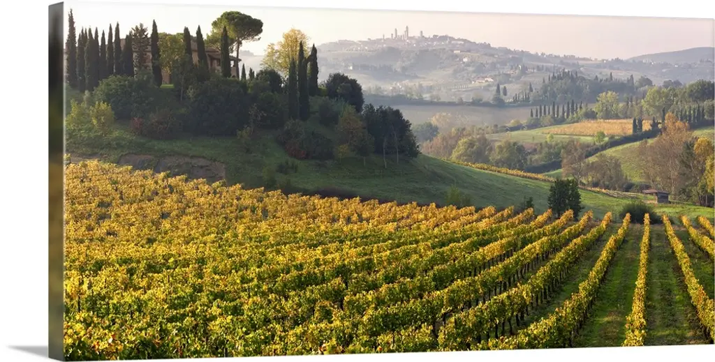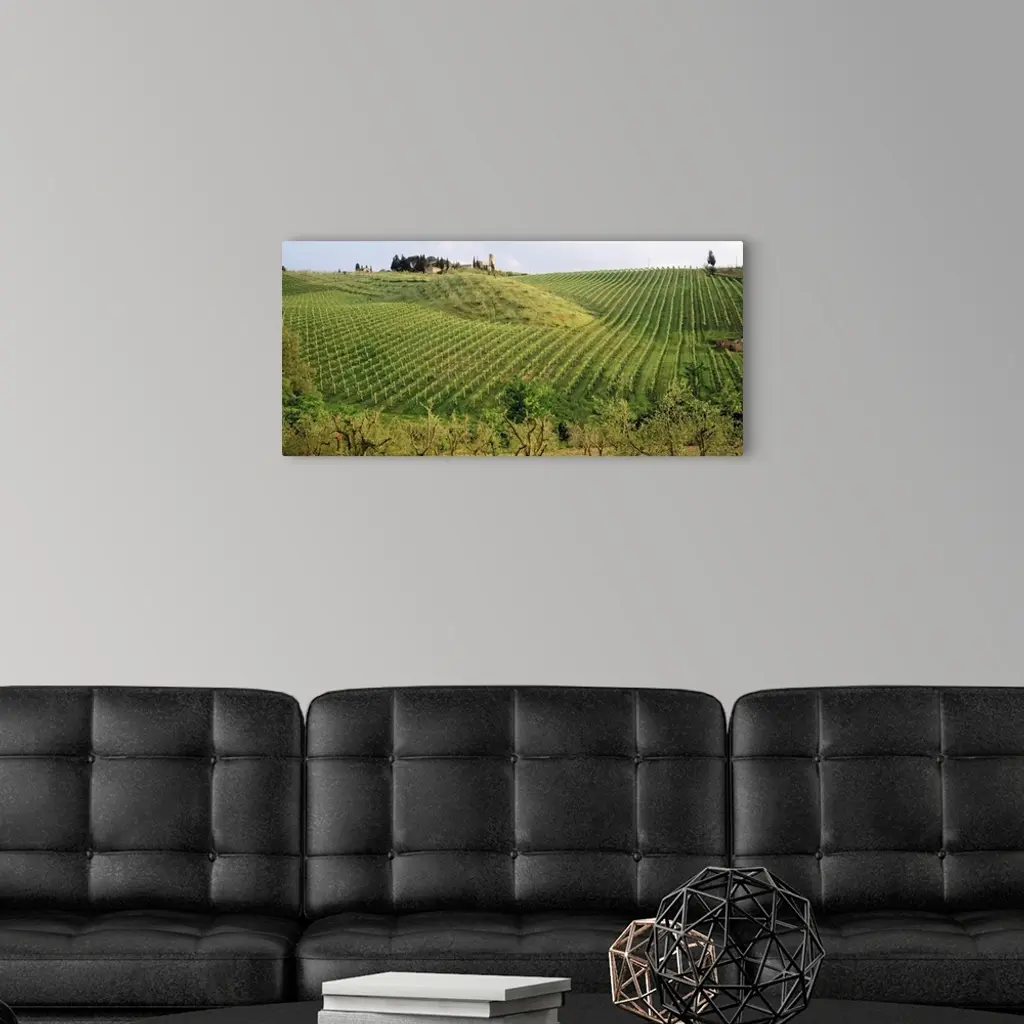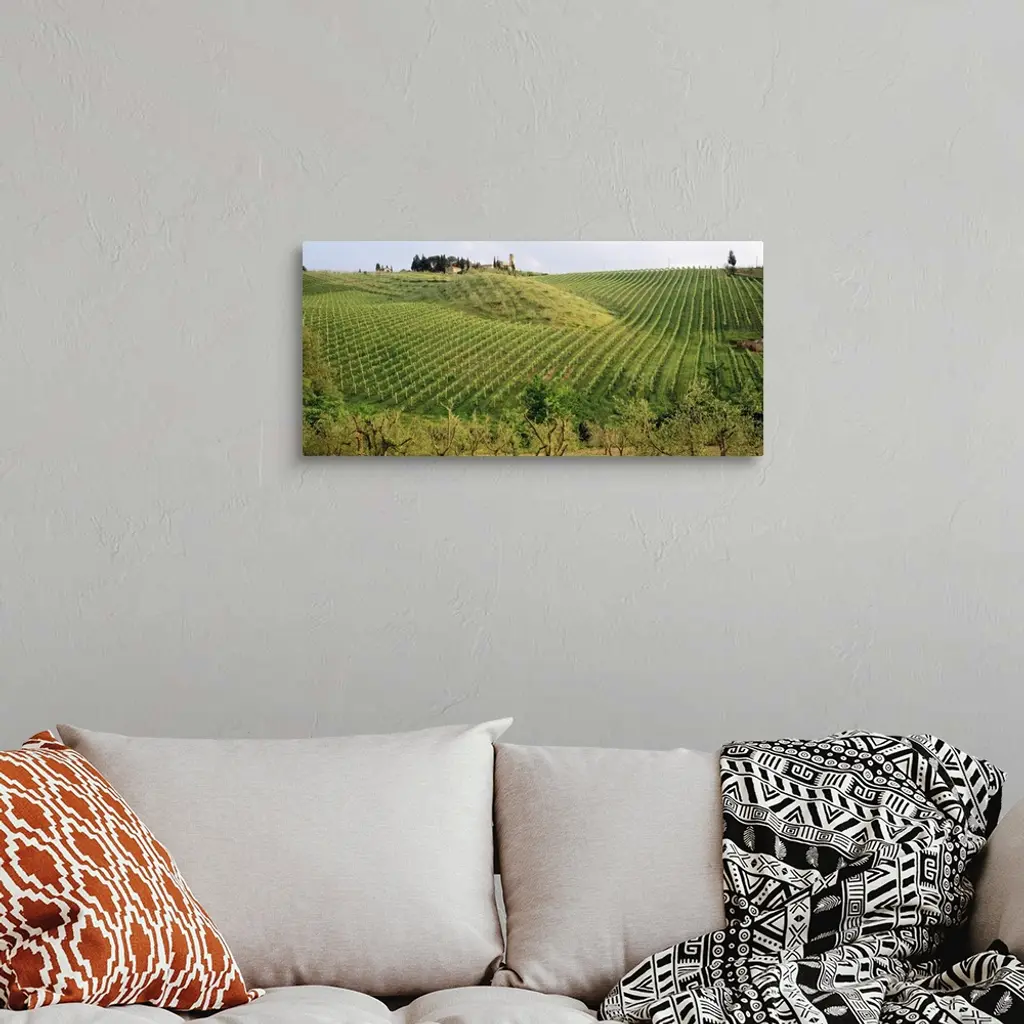 This panoramic photograph is taken of a large vineyard in Italy with the rows of vines going up a large hill.