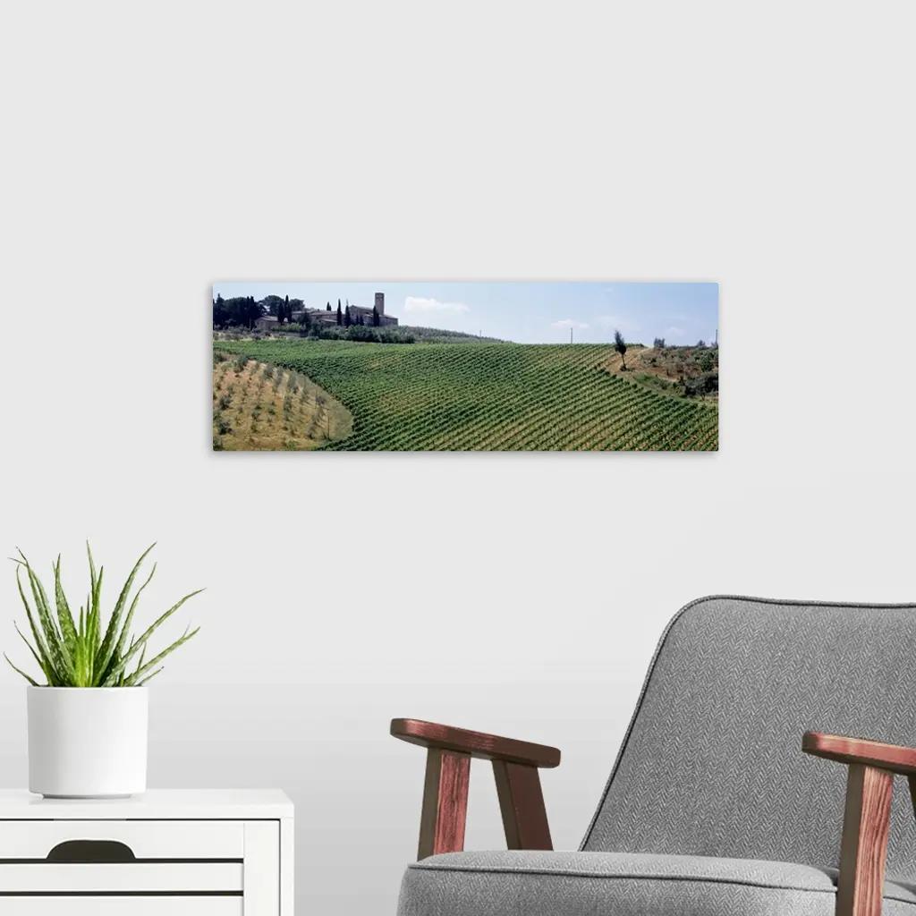 Panoramic image of rows of grape vines on a hill with the vineyard building sitting at the top.