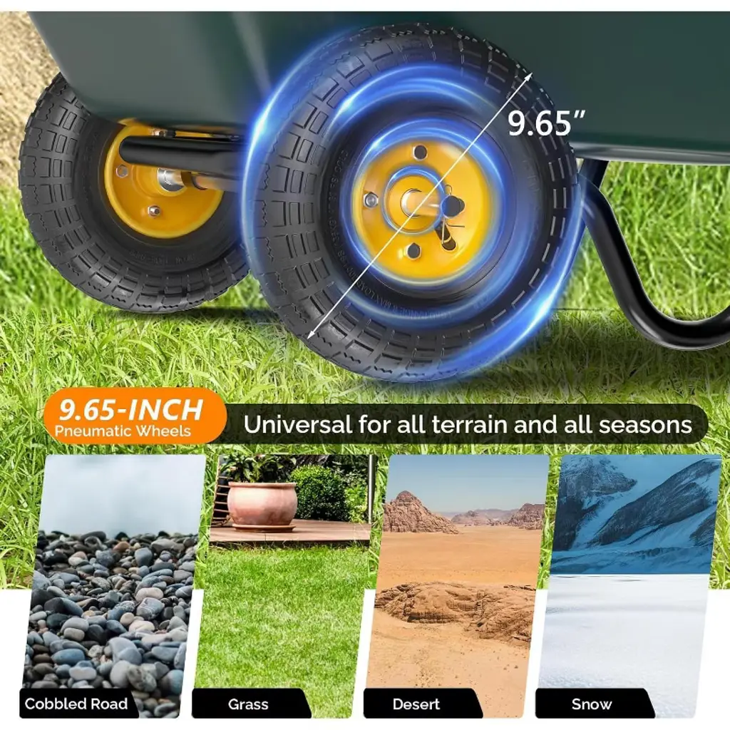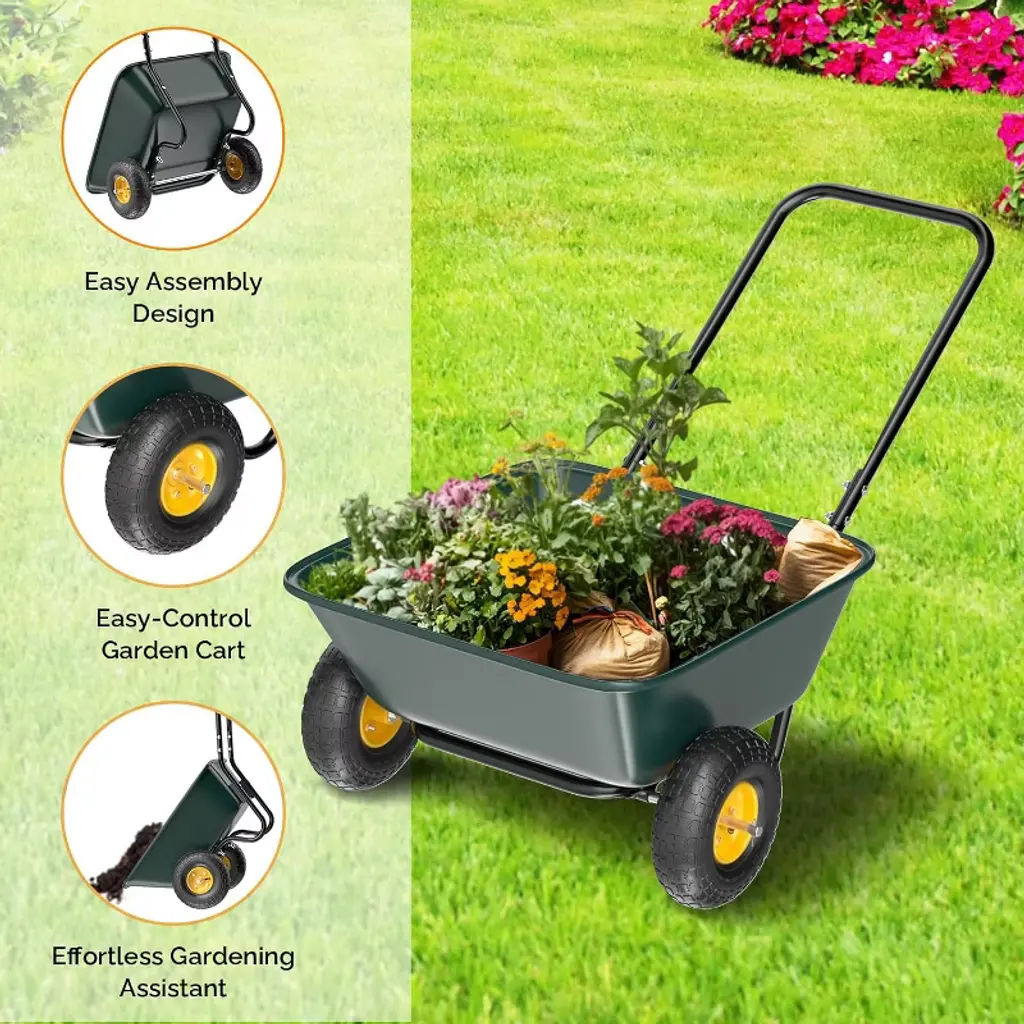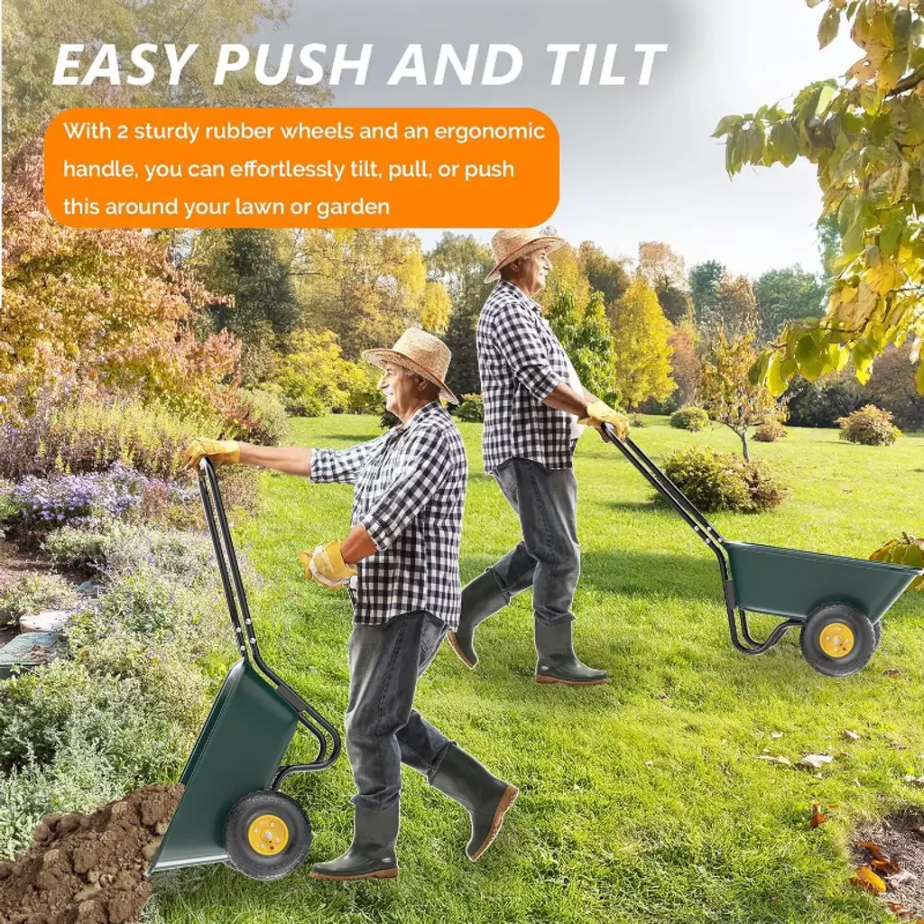 Features:1. Quick Dump Design: The unique 2-wheel tilt mechanism and low center of gravity let you dump loads smoothly and safely, making yard cleanup faster and easier.2. Heavy-Duty 300 lb Load Capacity: Built with a reinforced poly tub and sturdy steel frame, this cart easily hauls soil, mulch, firewood, tools, and more—perfect for any garden or landscaping project.3. Smooth Push & Pull: Equipped with an ergonomic U-shaped handle and wide rubber wheels, it glides effortlessly across grass, gravel, or uneven terrain with minimal effort.4. Spacious, Easy-to-Clean Tub: The generously sized tub measures 27.2 x 24.4 inches, offering ample room for large loads, and is rust-resistant and easy to rinse off after use.5. All-Weather Durability: Crafted from high-quality steel and impact-resistant plastic, this cart is built to withstand sun, rain, and heavy outdoor use season after season.Specifications:1. Overall Dimensions: (27.6 x 47.2 x 25.2) in / (70 x 120 x 64) cm2. Bed Dimensions: (24.4 x 27.2 x 8.3) in / (62 x 69 x 21) cm3. Inner Bed Size: (24.2 x 27 x 8.1) in / (61.5 x 68.5 x 20.5) cm4. Wheel Diameter: 9.6 in / 24.5 cm5. Axle Diameter: 4.9 in / 12.5 cm6. Handle Length: 20.5 in / 52 cm7. Material: Steel, Plastic8. Load Capacity: 300 lbsPackage Includes:1 x Poly Dump Cart