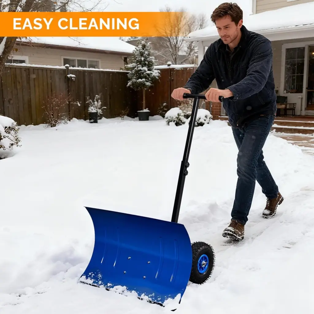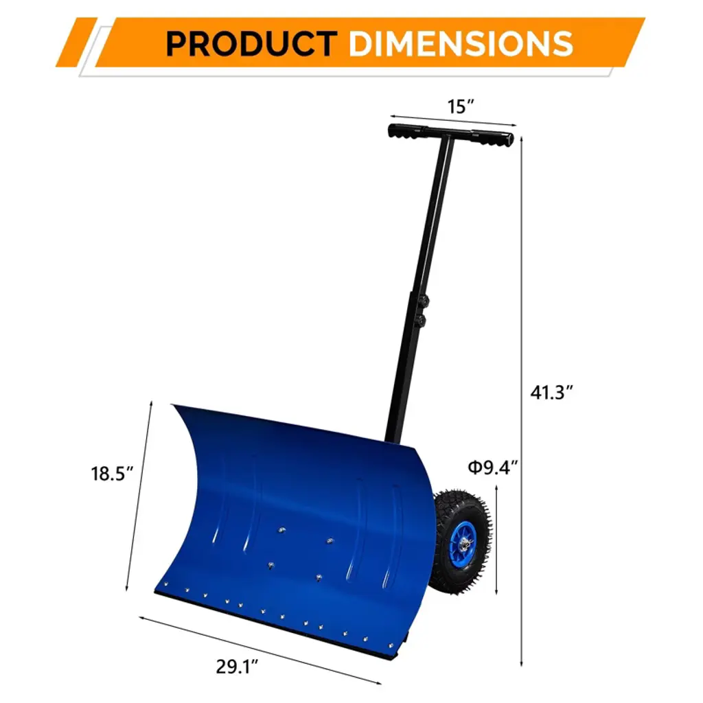 Vingli Snow Pusher With Wheels, 29" Adjustable T-handle Snow Plow For Driveway, Heavy Duty Wheeled Snow Shovel Angle Adjustable, Blue & Black