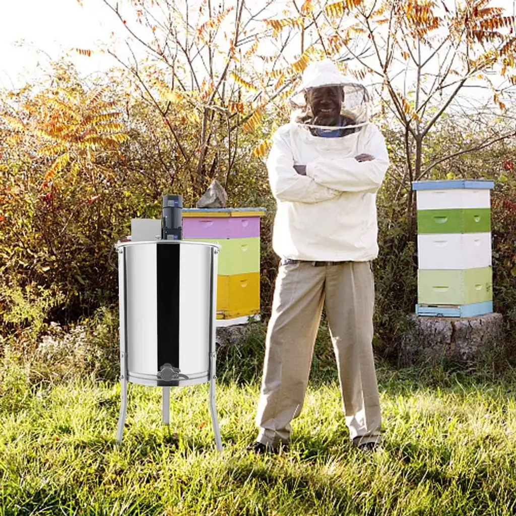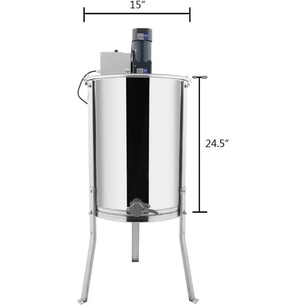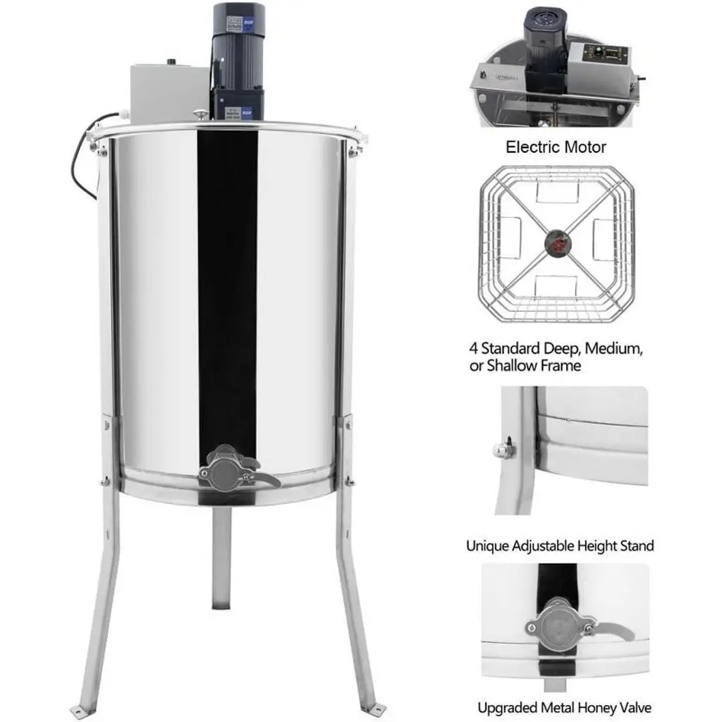 SIMPLE & FAST OPERATION: With a 110V AC Motor, simply turn the machine ON and choose the speed, then enjoy your free time! Our electric honey extractor gives you a hand-free experience while speeding up your honey producing efficiency.ANTI-RUST MATERIAL & EASY TO CLEAN: Top grade polished stainless steel frame resists rust and abrasion that's built to last, which is also a thoughtful idea for your health and safety. Barrel with sleek finish and seamless welding construction, which can be cleaned easily with soap water after each use.HEIGHT ADJUSTABLE LEGS : Three adjustable legs allow buckets in different sizes to sit underneath the honey gate. The stainless steel legs can be bolted to the floor and raise the drum, or remove the legs for tabletop use.LARGE FRAME HOLDER: Inner basket holds up to 4 standard deep, medium, or shallow at once. It is slightly rounded to the inner side in order protect your honeycombs from breaking. The enclosed gear upon the frame will not contaminate the honey.EASY ASSEMBLY: Well-craft and easy installation honey gate valve for convenient use. The clear glass lid is well-positioned within the extractor for easy viewing, also keeps off dust and other particles during extraction.