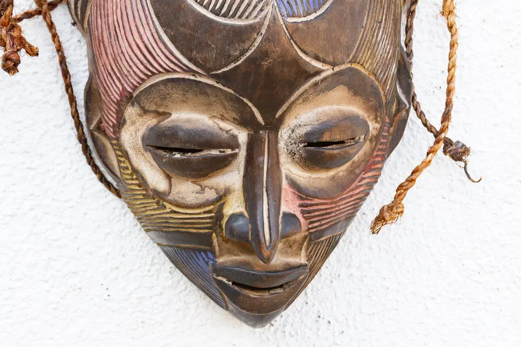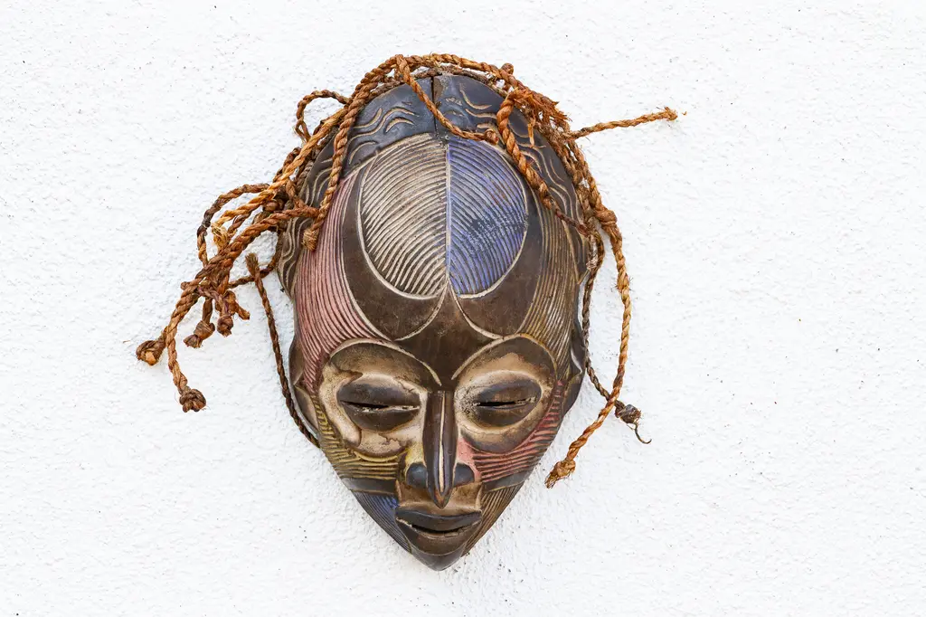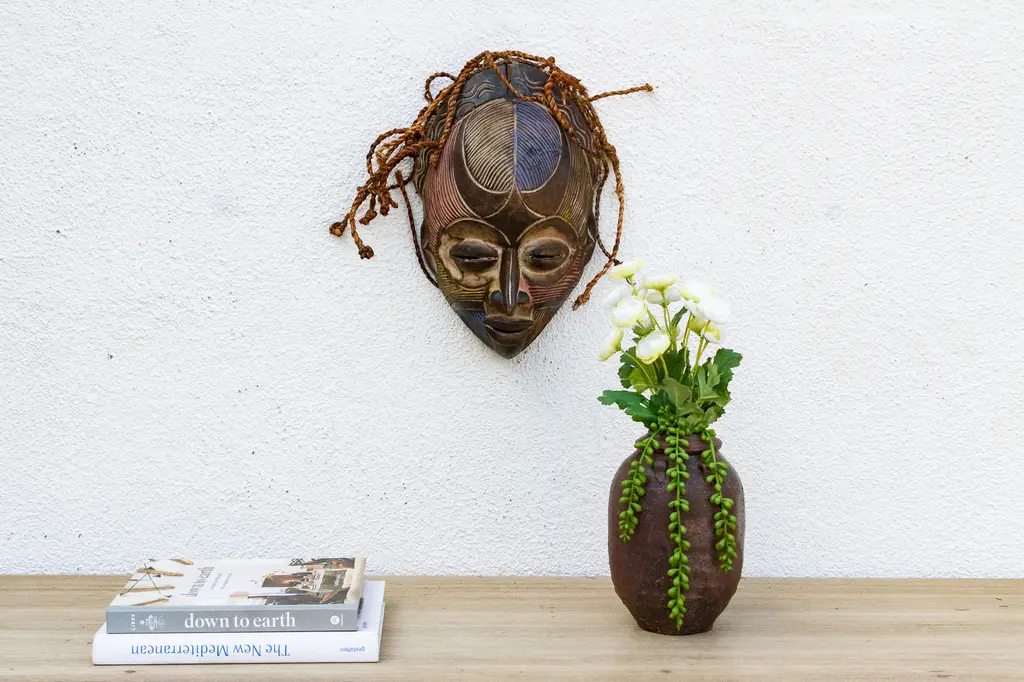 This serene Guro mask from the Ivory Coast is a beautiful example of African tribal art. The mask is characterized by its unique hairstyle, with long, braided strands adorned with beads and other embellishments. The face is elongated with a delicate nose, closed eyes, and a slightly open mouth, conveying a sense of tranquility and inner peace. The surface is adorned with a rich patina, which speaks to its age and use in ceremonial dances and rituals.
